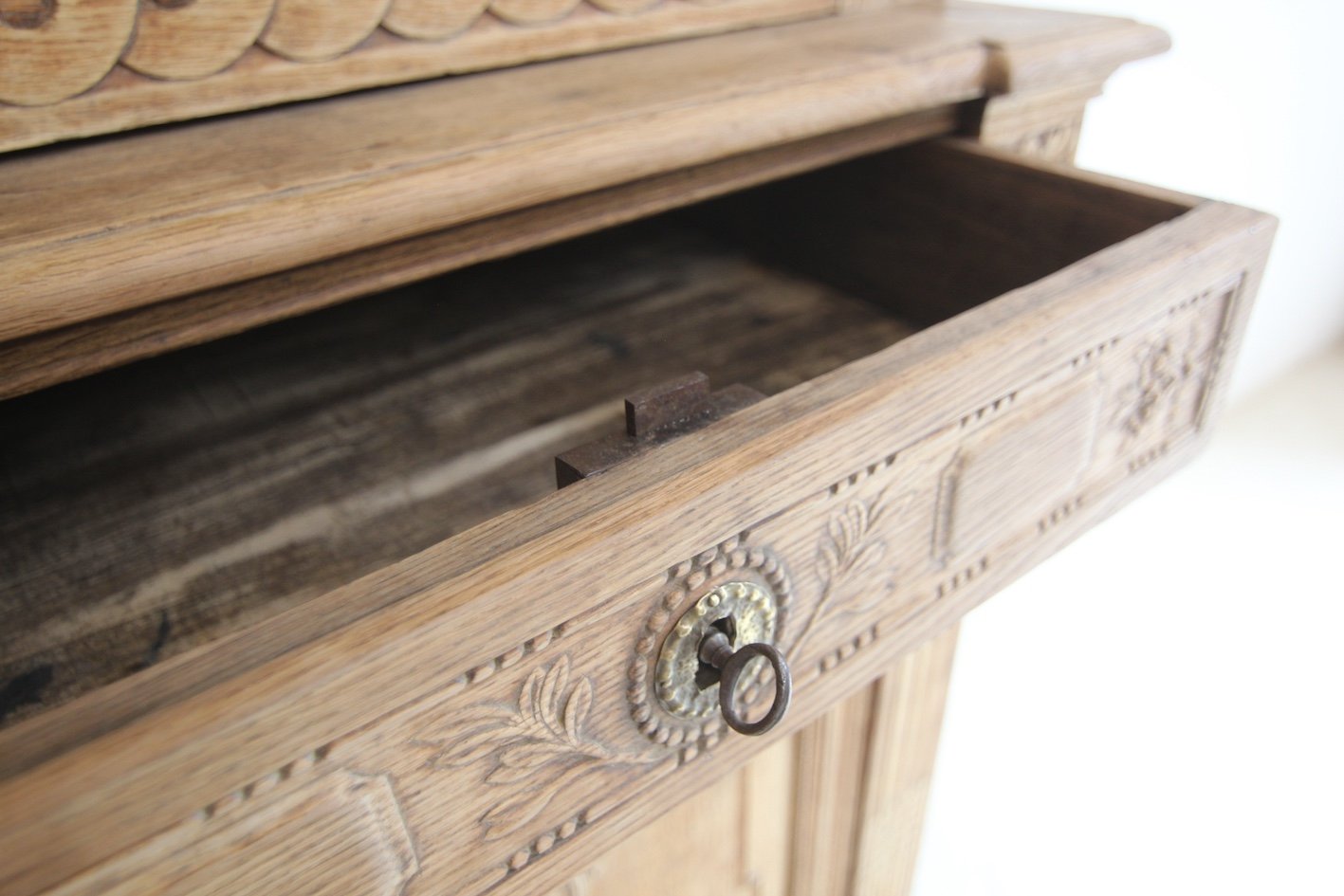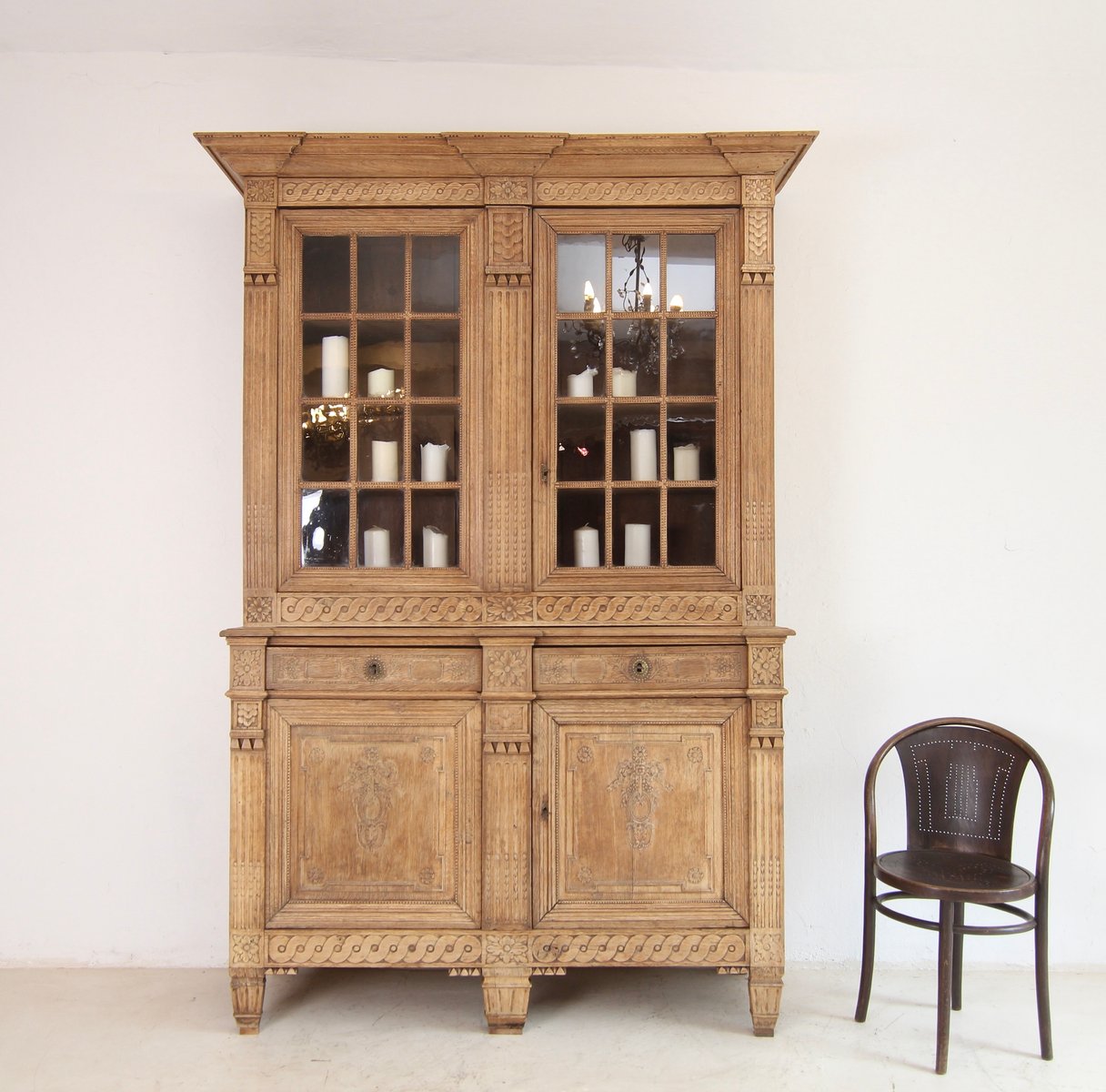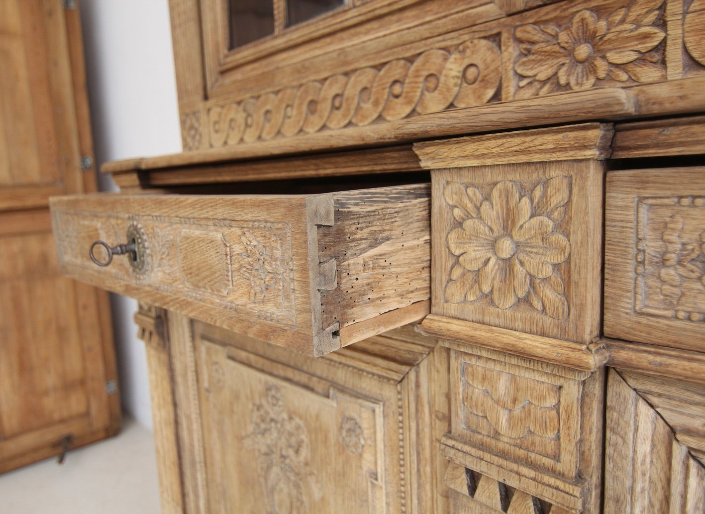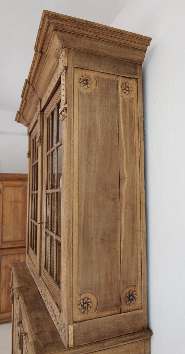 Good authentic condition with age-related signs of wear, including minor damage, old woodworm channels (not active!) and visible repairs. Four glass panes had to be replaced with new ones. The lid has been re-glued. The front feet have been raised. The old dark surface coating has been removed from the outside of the wood and bleached, so that the natural texture of the old oak wood now appears unsealed and light in colour.