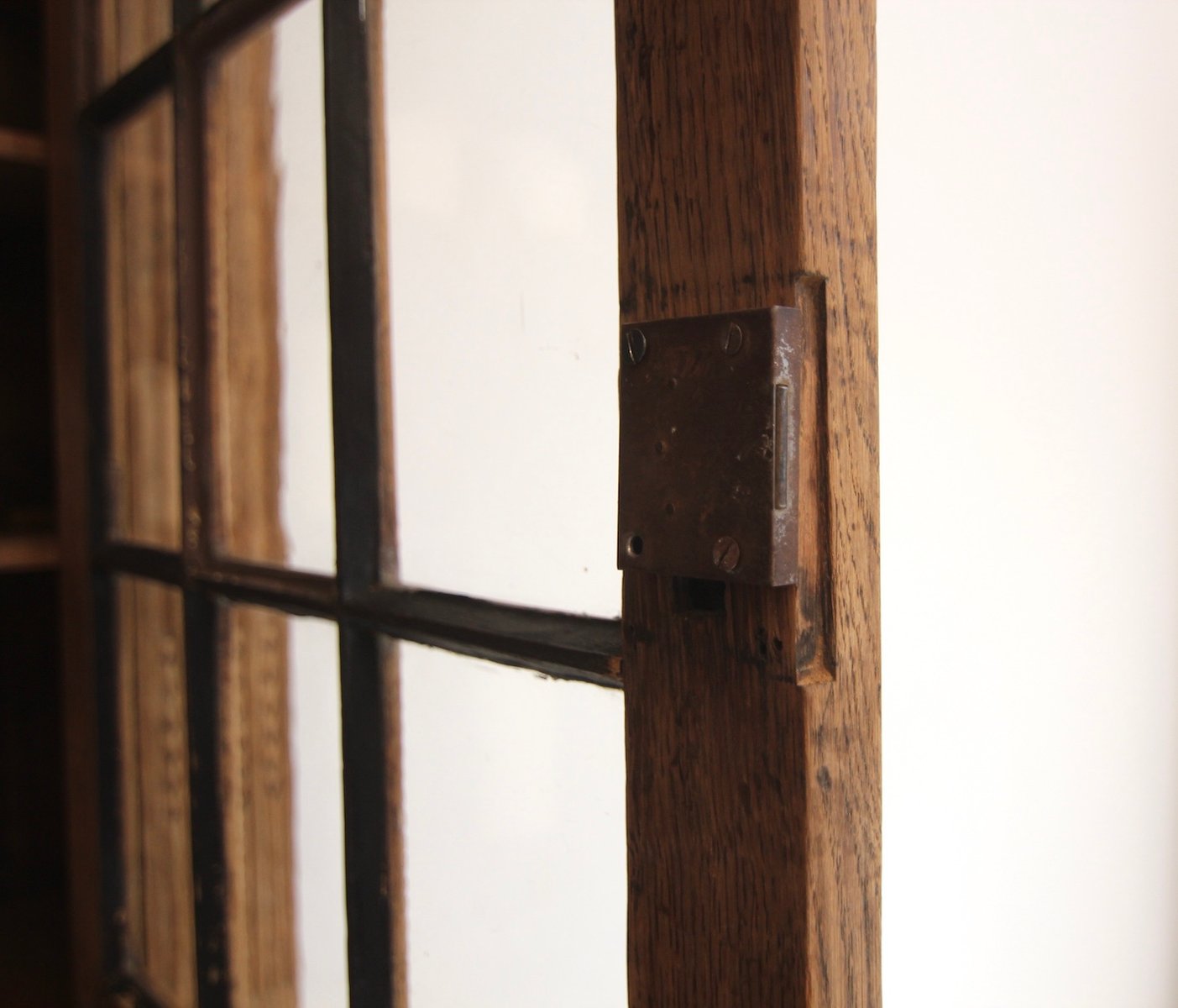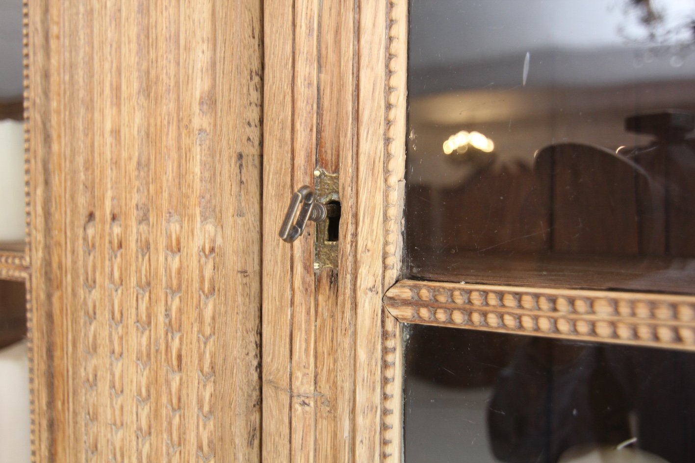 Guter authentischer Zustand mit altersbedingten Gebrauchsspuren, darunter kleinere Beschädigungen, alte Holzwurmkanäle (nicht aktiv!) und sichtbare Reparaturen. Vier Glasscheiben mussten durch neue ersetzt werden. Der Deckel wurde neu verleimt. Die vorderen Füße wurden angehoben. Die alte dunkle Oberflächenbeschichtung wurde von der Außenseite des Holzes entfernt und gebleicht, so dass die natürliche Textur des alten Eichenholzes nun unversiegelt und hell erscheint.