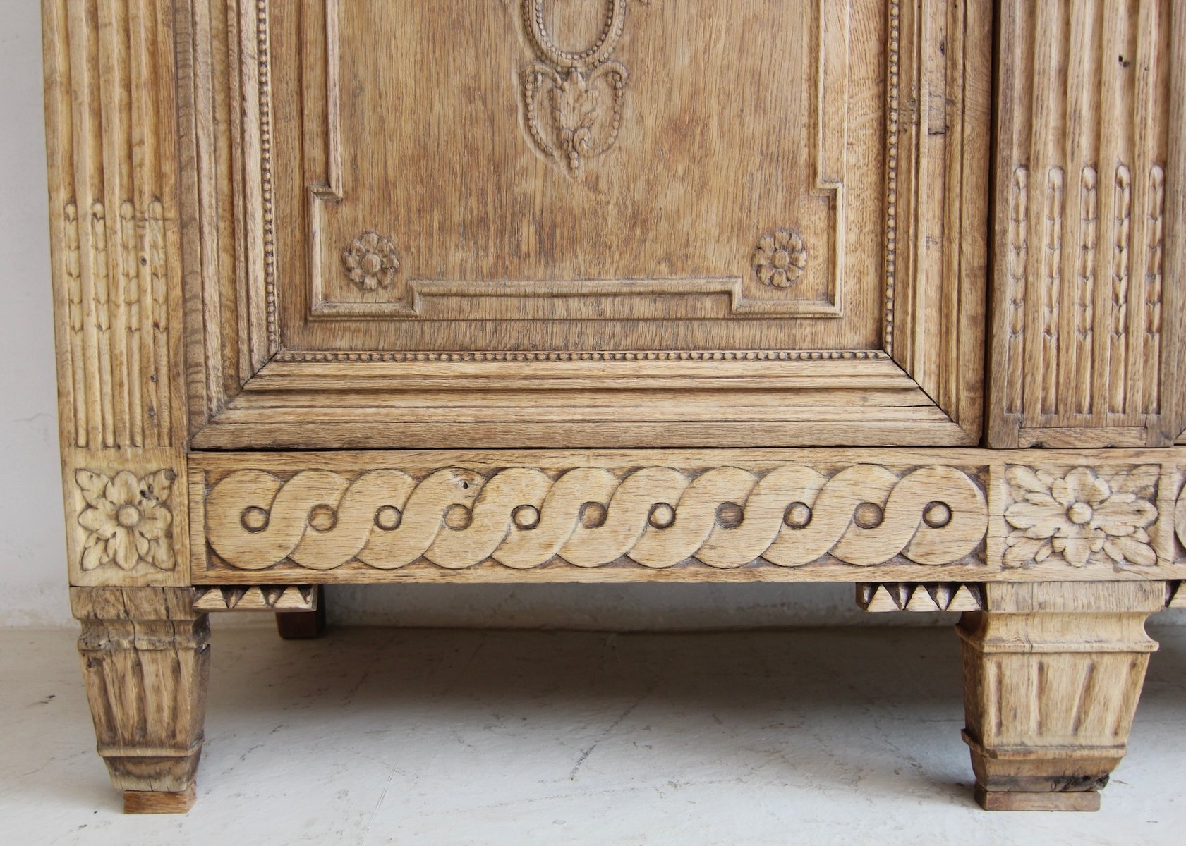 The front is divided vertically by fluted pilaster strips that end in slightly tapered feet and is carved with floral motifs and various flat friezes. Below this are wickerwork, beadwork, dentil and scale motifs. The strike plate on the left door leaf also serves as a central pilaster strip.