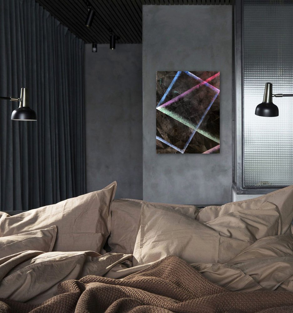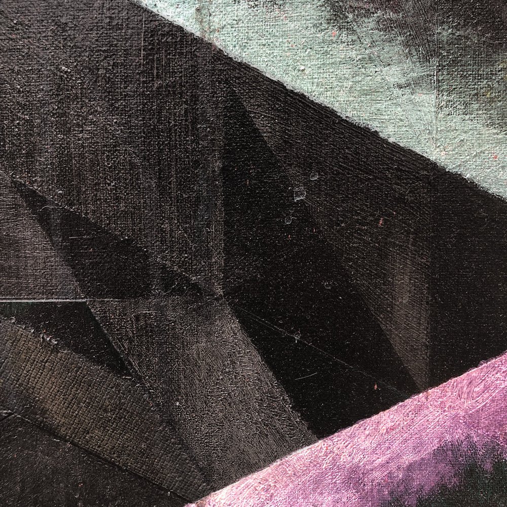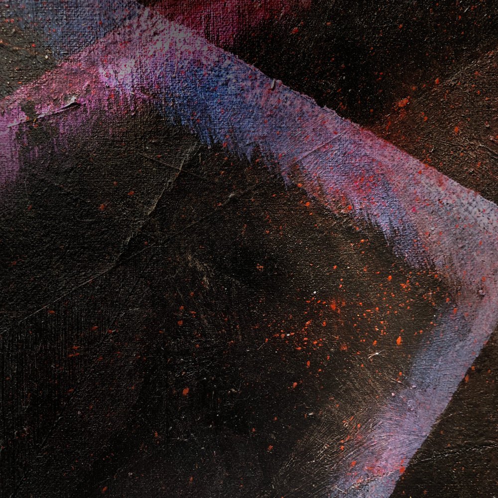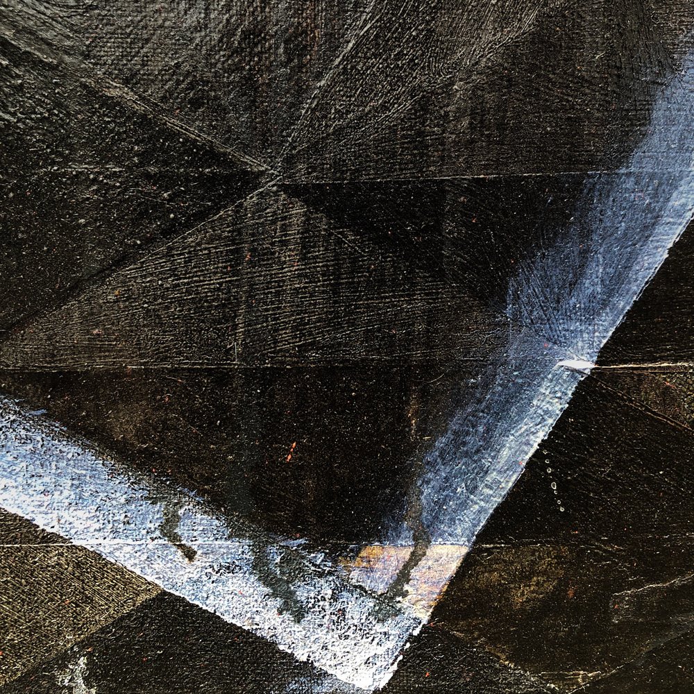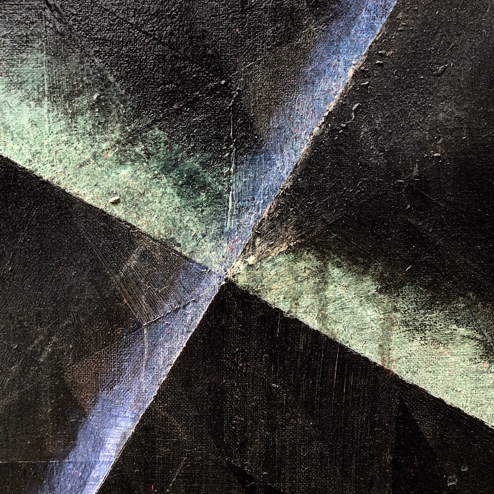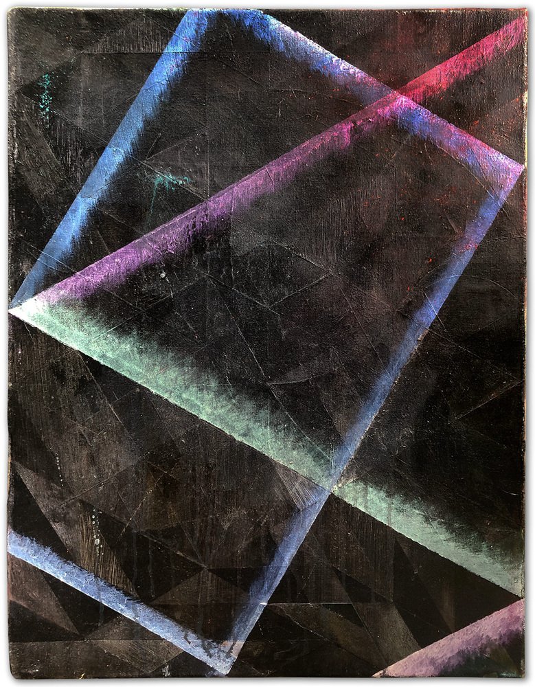 A moody painting with the texture of tar and the weight of a thousand suns. The surface is a hard-to-read network of isometric triangles of blacker-than-black paint patches over which play shafts of spraypainted laser light.