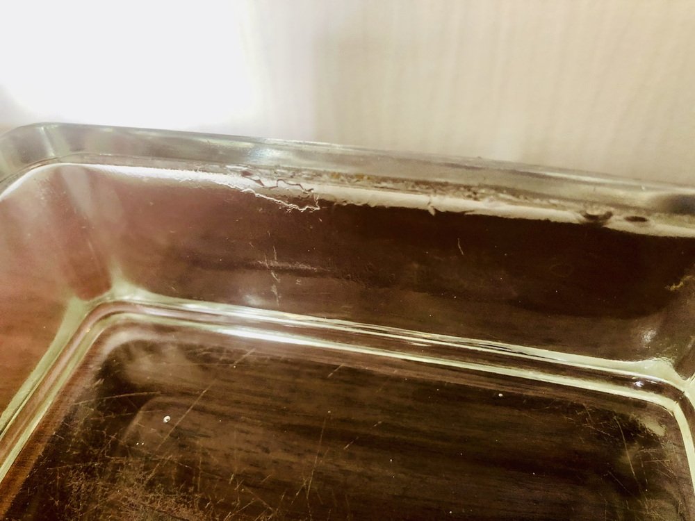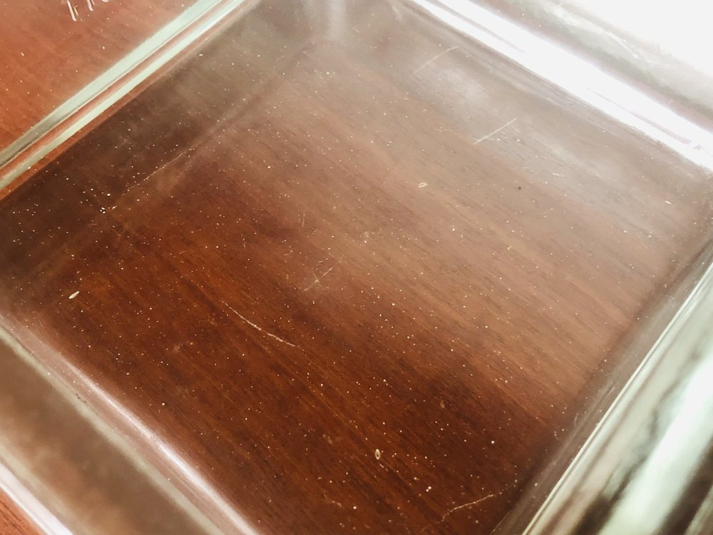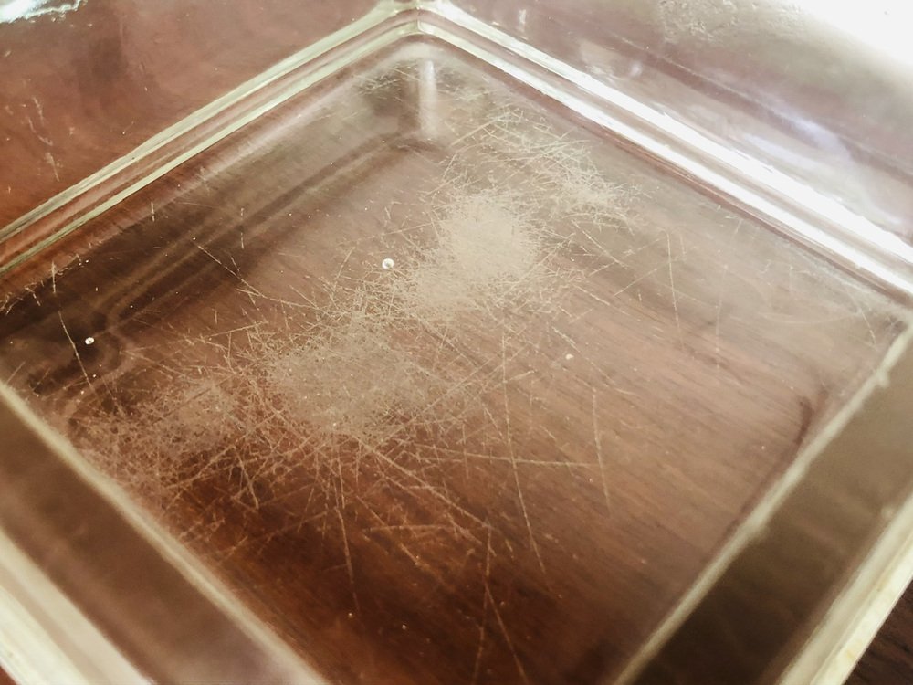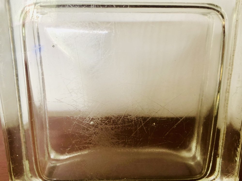 Light marks and signs of previous use and age as well as patina of time on the overall structures of both pieces. Light micro scratches at bottom ( see photos). A small mark on the trim of the larger one ( see photo next to 1 cent coin for perspective). They both have natural air bubbles in the molded glass as well as natural marks on the trims and sides ( See photo).