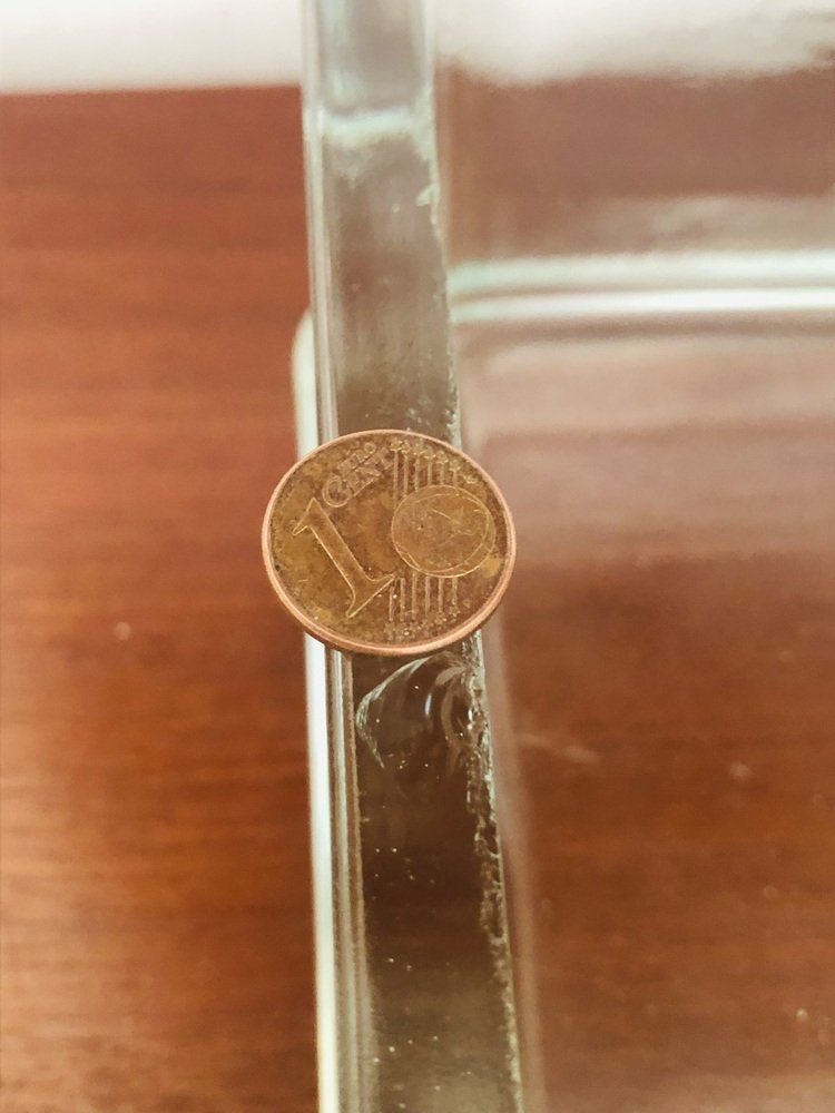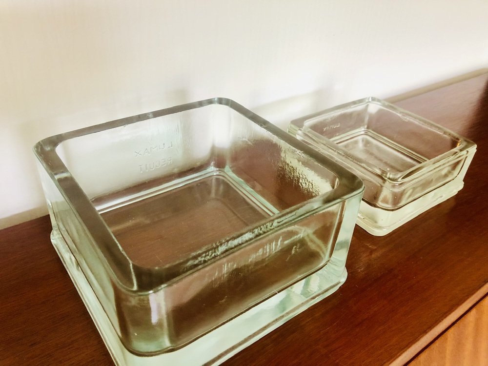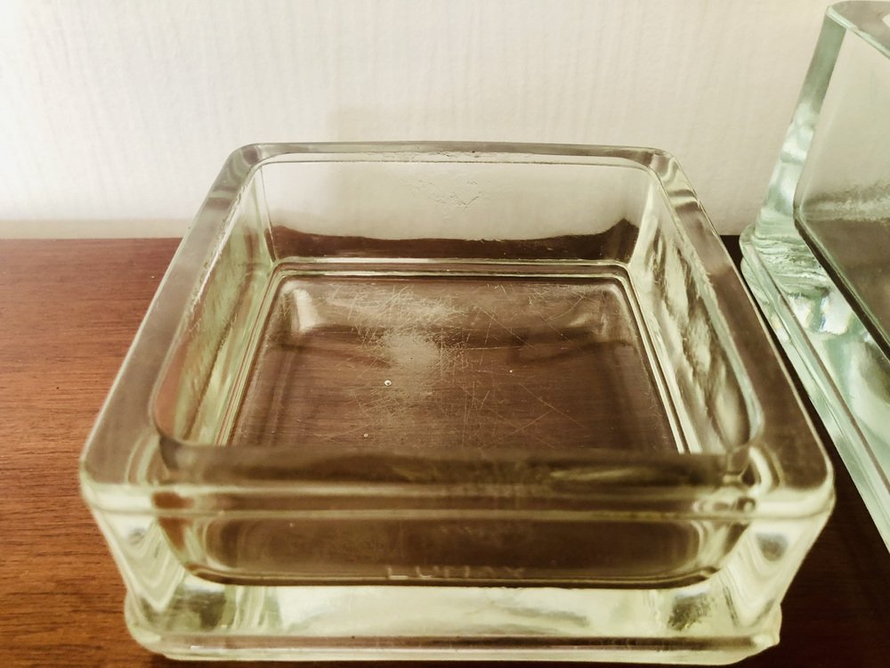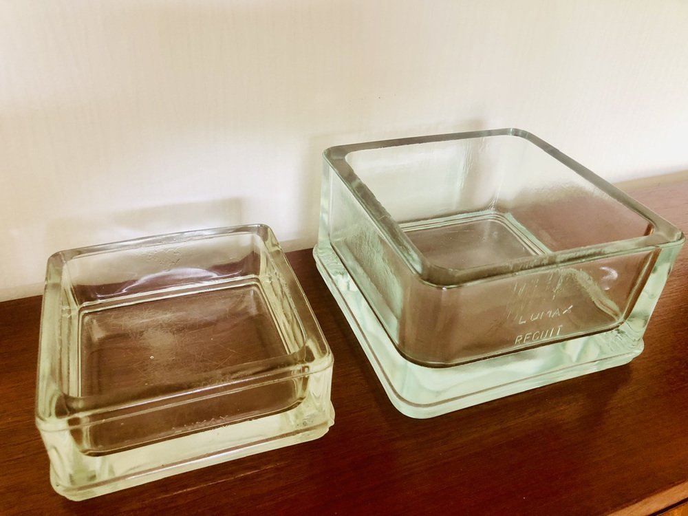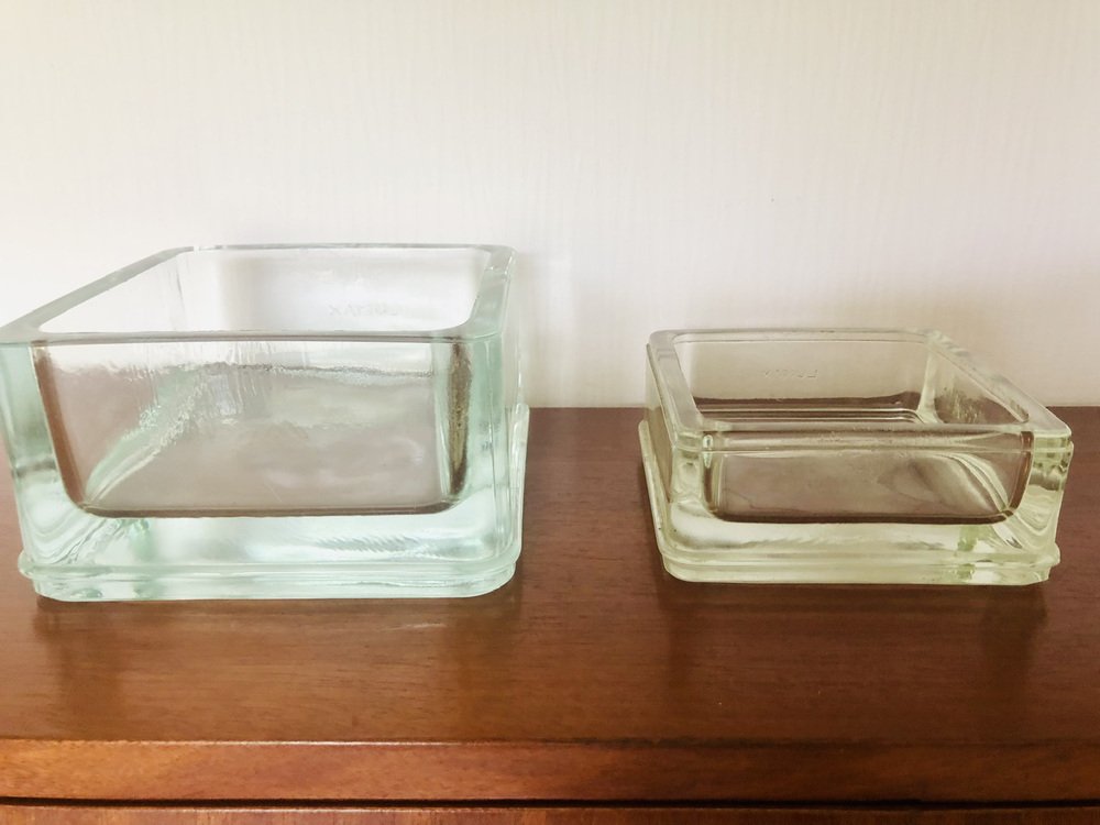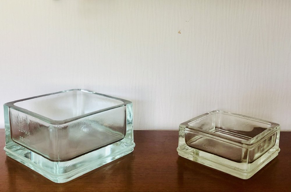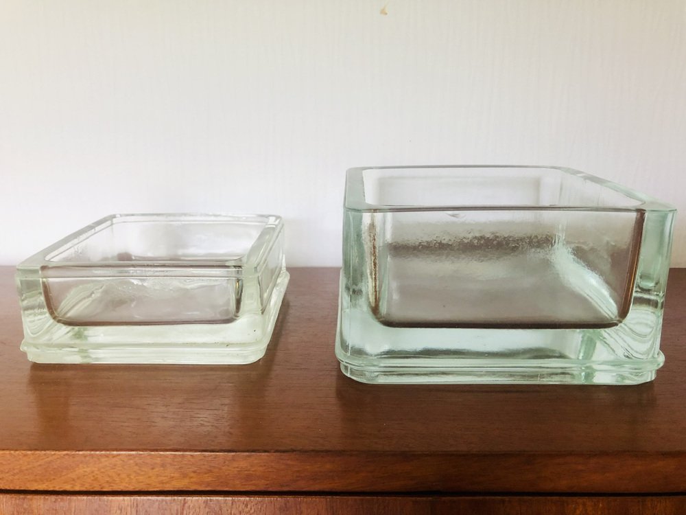 Leichte Gebrauchsspuren und Alterserscheinungen sowie Patina der Zeit auf den Gesamtstrukturen der beiden Stücke. Leichte Mikrokratzer an der Unterseite (siehe Fotos). Ein kleiner Fleck auf dem Rand des größeren Stücks (siehe Foto neben der 1-Cent-Münze für die Perspektive). Sie haben beide natürliche Luftblasen in der geformten Glas sowie natürliche Markierungen auf den Rändern und Seiten (siehe Foto).