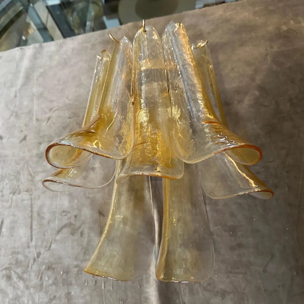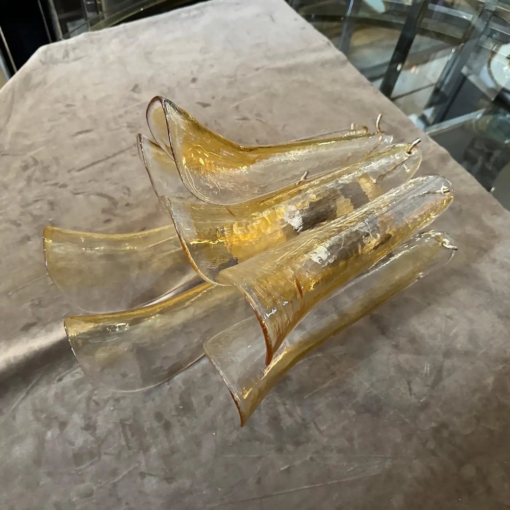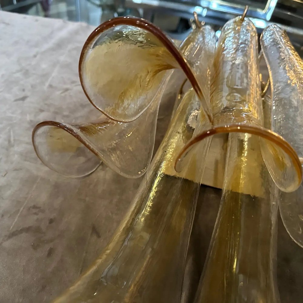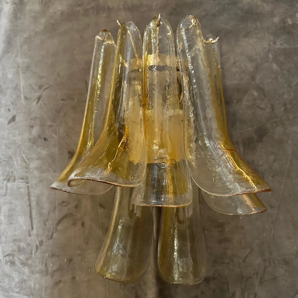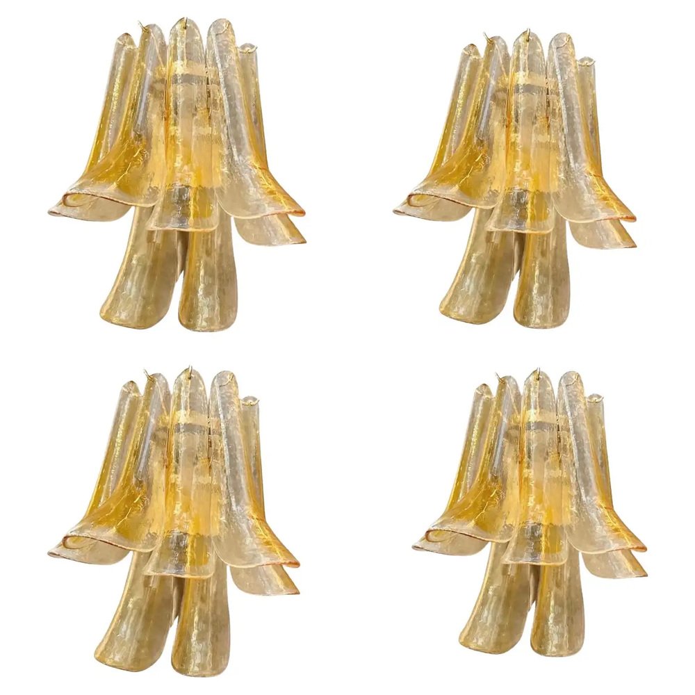 Diese vier Wandleuchten sind exquisite Beispiele für italienische Beleuchtung aus der Jahrhundertmitte der 1970er Jahre. Sie wurden von La Murrina hergestellt und haben eine Markierung auf jedem Glas. Jede Leuchte verfügt über mundgeblasene Blütenblätter aus Muranoglas in einer atemberaubenden Kombination aus klaren und bernsteinfarbenen Tönen. Das Design ähnelt kaskadenartig angeordneten Blütenblättern, was einen skulpturalen und eleganten Effekt erzeugt. Die Glasblütenblätter sind in Schichten angeordnet, was den Leuchtern Tiefe und ein warmes, diffuses Licht verleiht. Die organischen Kurven des Glases stehen in schönem Kontrast zu dem strukturierten, vergoldeten Metallrahmen, der sich hinter dem Design verbirgt. Der dezente Goldton der braunen Akzente unterstreicht den Vintage-Charme und sorgt für zeitlose Eleganz. Diese Stücke wären eine auffällige Ergänzung für jede moderne oder zeitgenössische Einrichtung, die sowohl Kunst als auch Funktionalität in den Raum bringt. Sie sind funktionstüchtig und insgesamt in einem sehr guten Zustand.