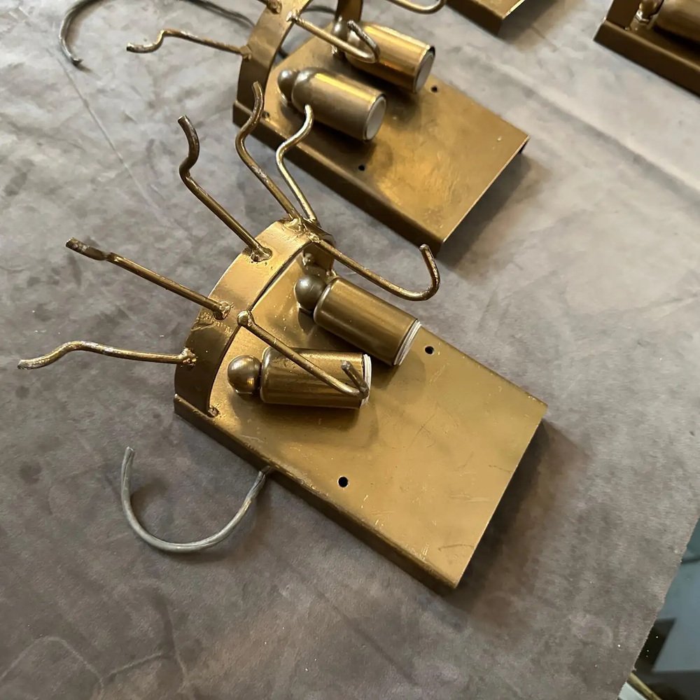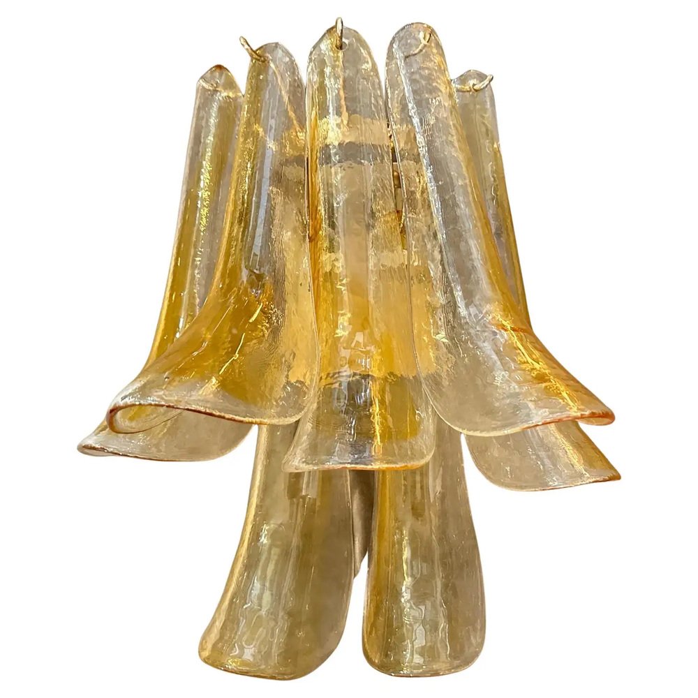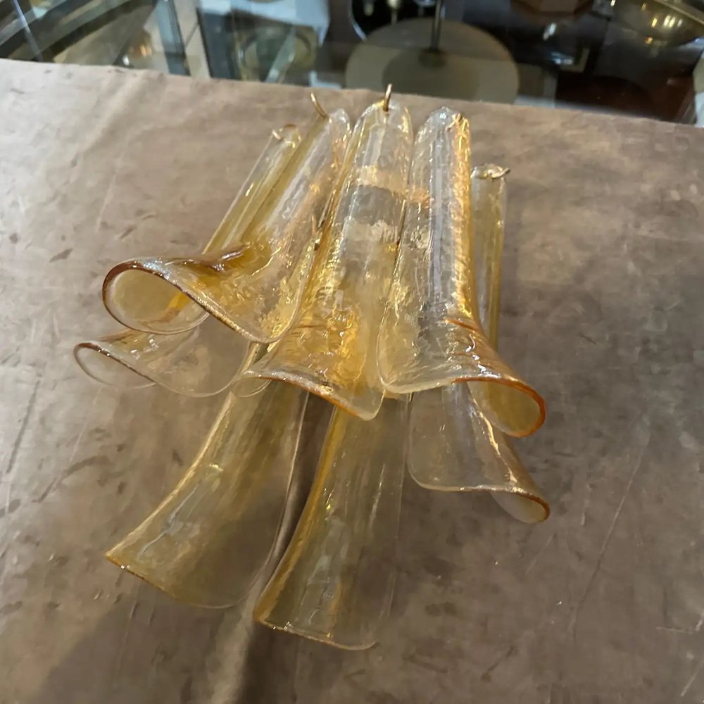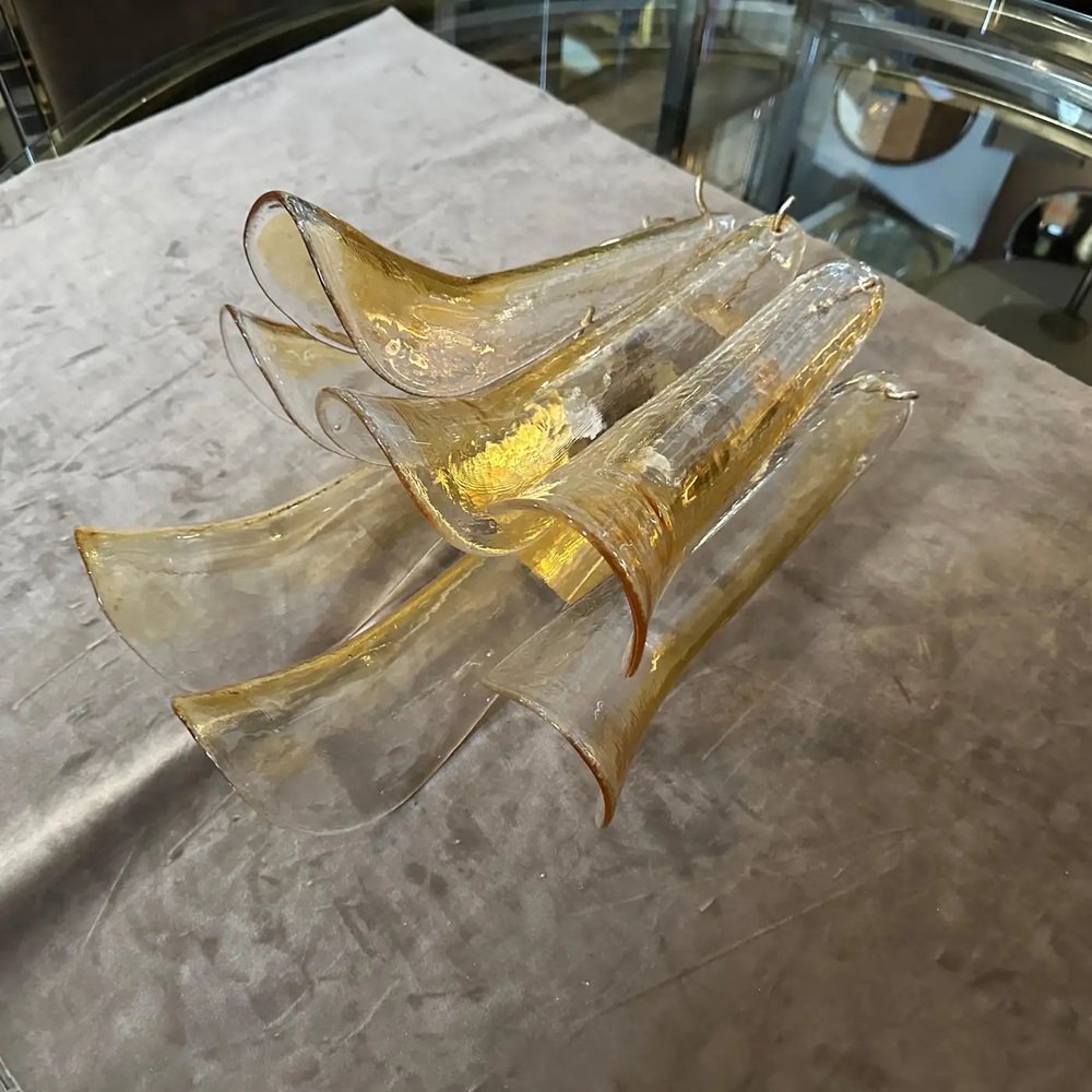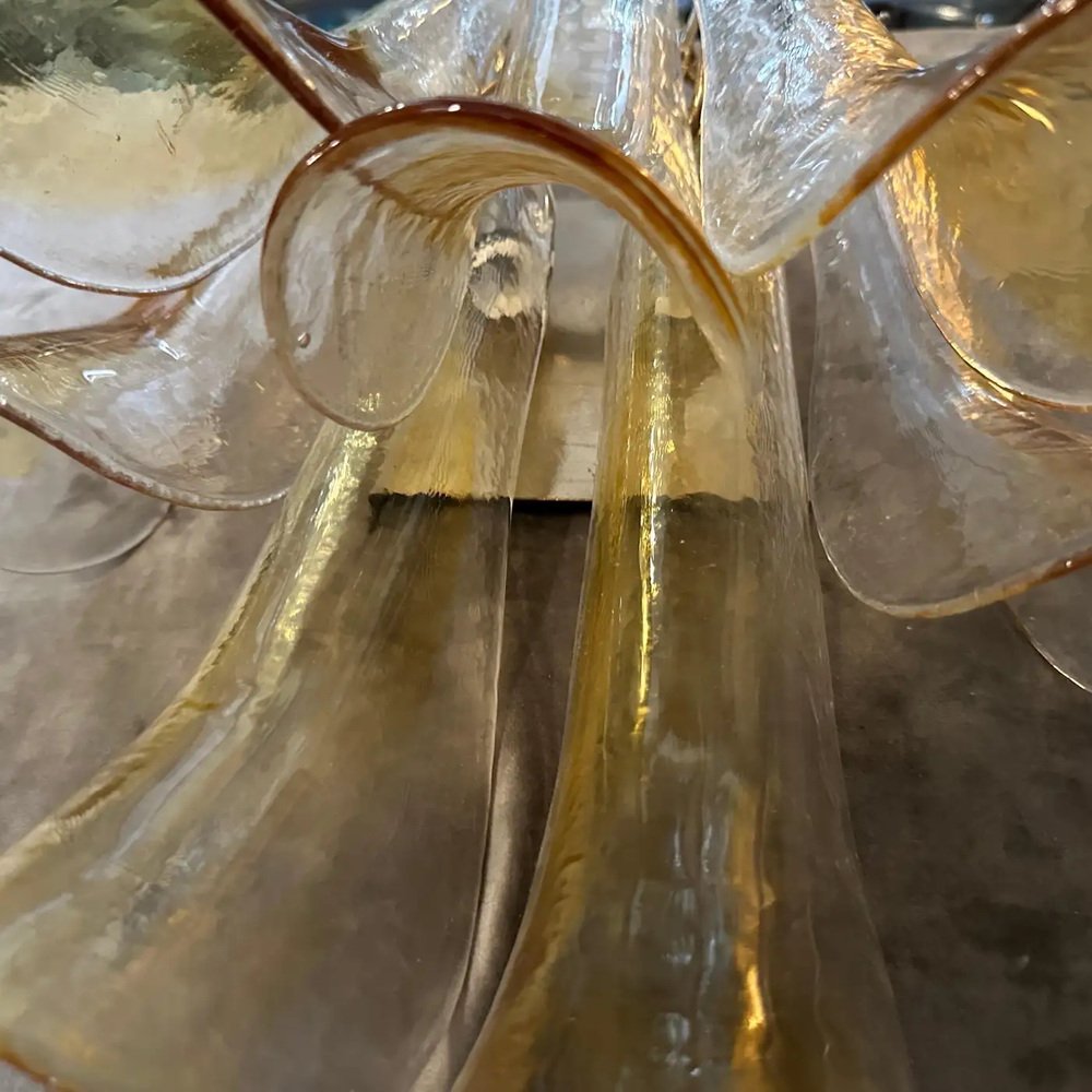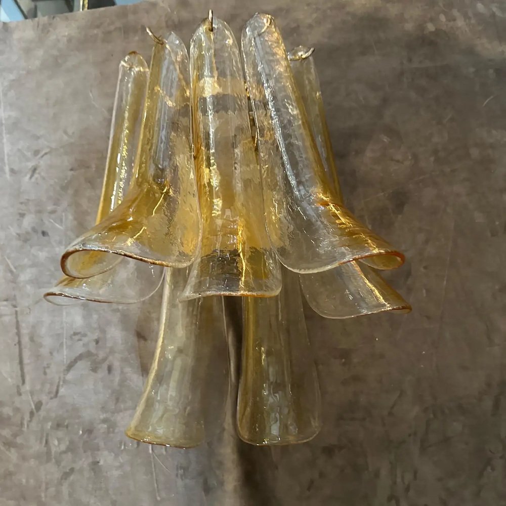 Diese vier Wandleuchten sind exquisite Beispiele für italienische Beleuchtung aus der Jahrhundertmitte der 1970er Jahre. Sie wurden von La Murrina hergestellt und haben eine Markierung auf jedem Glas. Jede Leuchte verfügt über mundgeblasene Blütenblätter aus Muranoglas in einer atemberaubenden Kombination aus klaren und bernsteinfarbenen Tönen. Das Design ähnelt kaskadenartig angeordneten Blütenblättern, was einen skulpturalen und eleganten Effekt erzeugt. Die Glasblütenblätter sind in Schichten angeordnet, was den Leuchtern Tiefe und ein warmes, diffuses Licht verleiht. Die organischen Kurven des Glases stehen in schönem Kontrast zu dem strukturierten, vergoldeten Metallrahmen, der sich hinter dem Design verbirgt. Der dezente Goldton der braunen Akzente unterstreicht den Vintage-Charme und sorgt für zeitlose Eleganz. Diese Stücke wären eine auffällige Ergänzung für jede moderne oder zeitgenössische Einrichtung, die sowohl Kunst als auch Funktionalität in den Raum bringt. Sie sind funktionstüchtig und insgesamt in einem sehr guten Zustand.