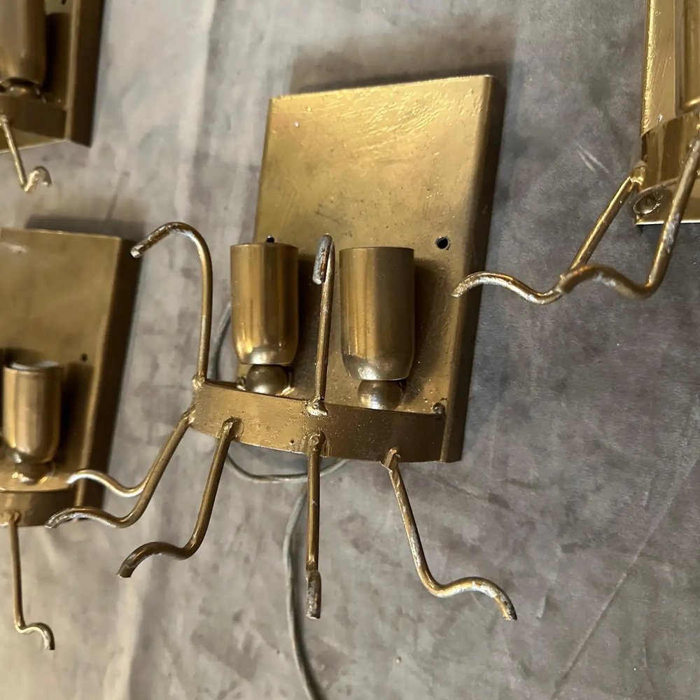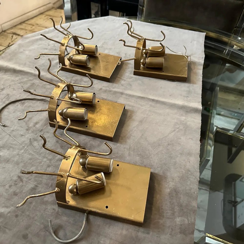 These four wall sconces are exquisite examples of 1970s Mid-Century Modern Italian lighting, crafted by La Murrina, they have mark on each glass. Each sconce features hand-blown Murano glass petals in a stunning combination of clear and amber-brown tones. The design resembles cascading flower petals, creating a sculptural and elegant effect. The glass petals are arranged in a layered fashion, giving the sconces depth and a warm, diffused light when illuminated. The organic curves of the glass contrast beautifully with the structured gilded metal frame hidden behind the design. The subtle golden hue of the brown accents enhances the vintage appeal while maintaining a timeless elegance. These pieces would make a striking addition to any Mid-Century Modern or contemporary interior, adding both artistry and functionality to a space. They are in working order and in very good condition overall.