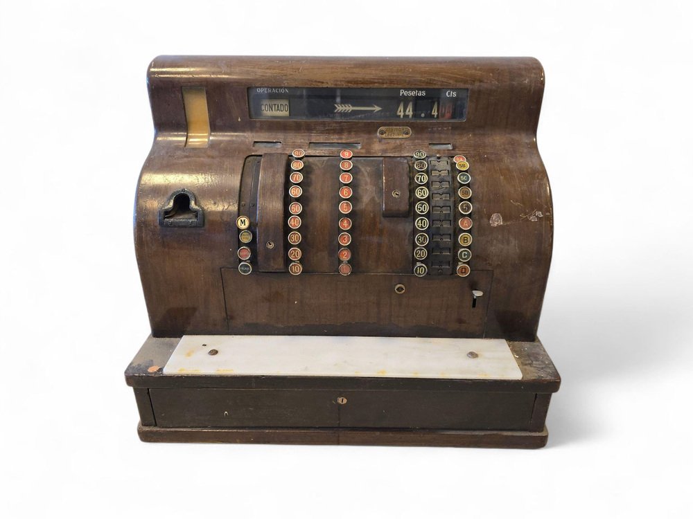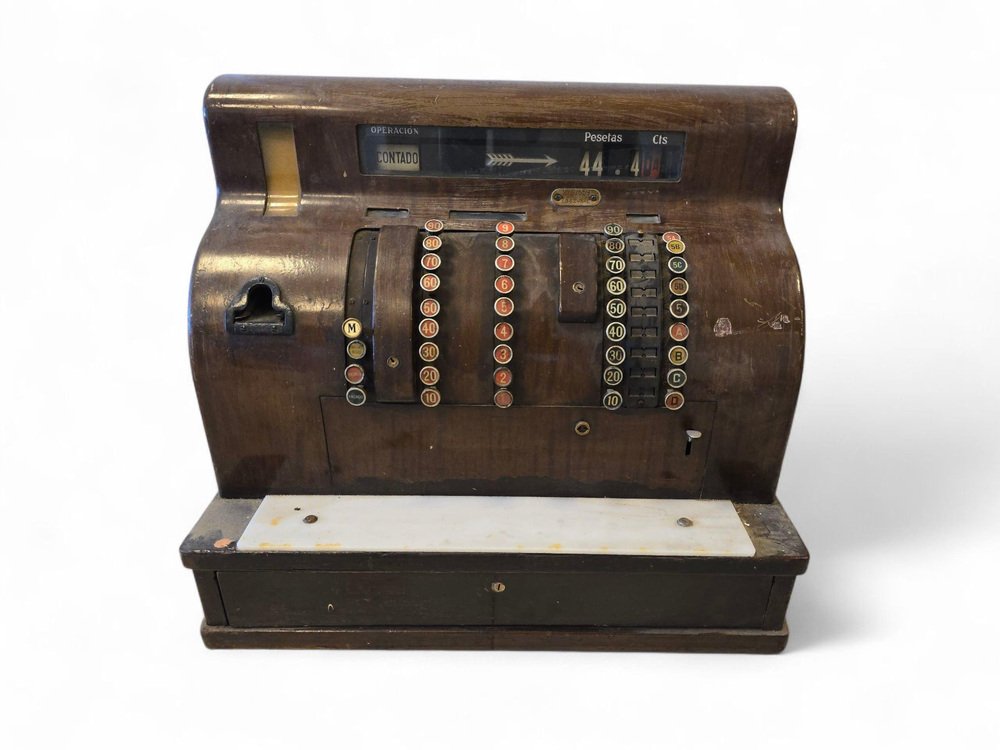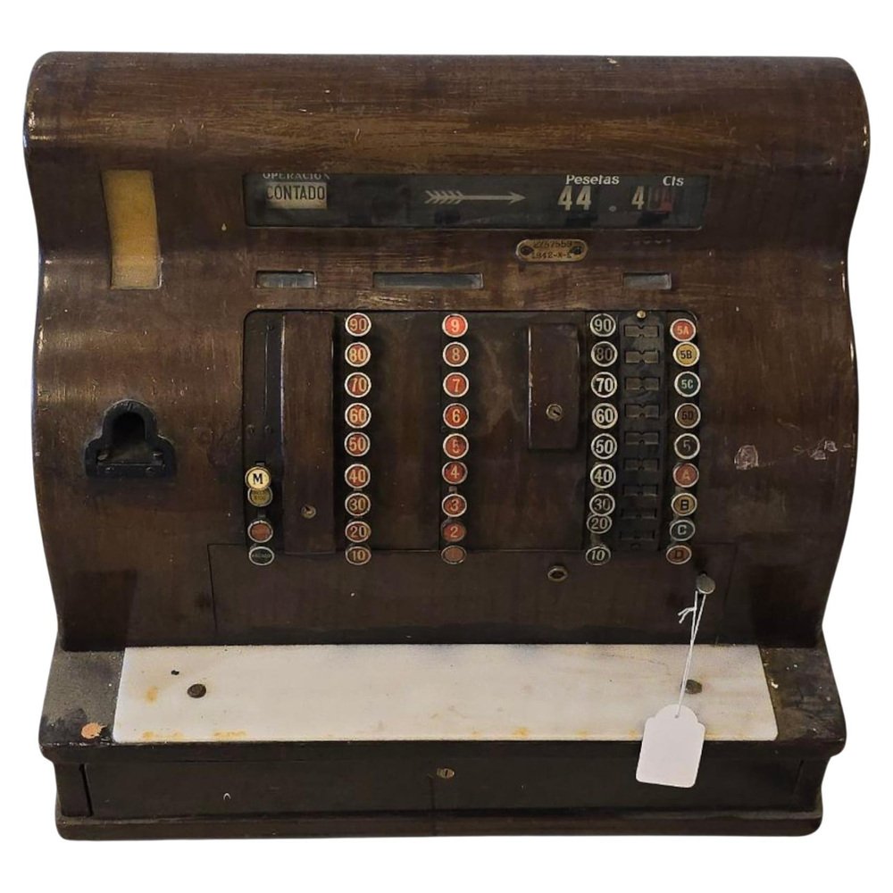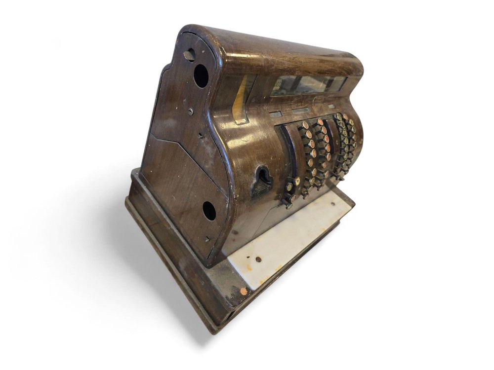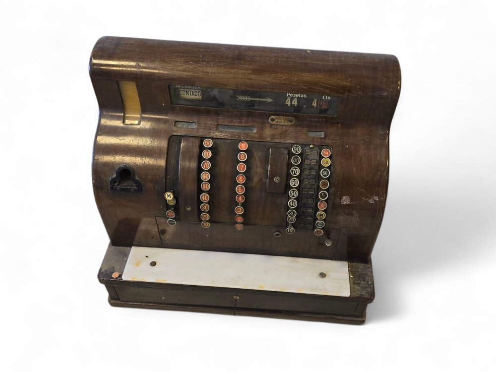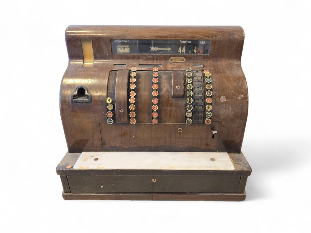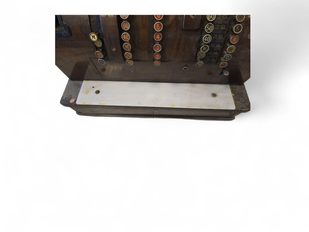 Abmessungen: Höhe 60 cm (23,6 in), Breite 45 cm (17,7 in), Tiefe 50 cm (19,7 in). Eine auffällige Registrierkasse mit Sammlerwert, die sich perfekt als Blickfang in einem vom Einzelhandel inspirierten Interieur, einer Bar oder einer Einrichtung im Industriestil eignet.