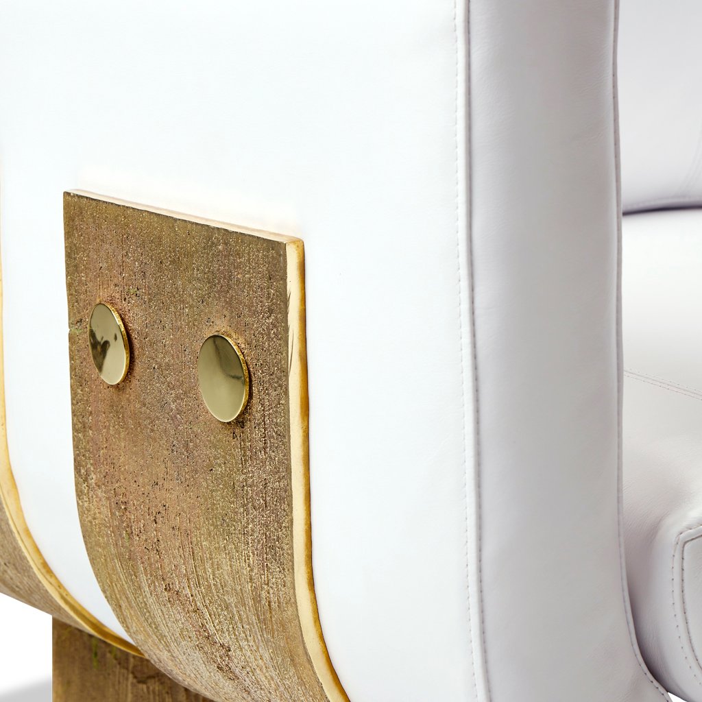 Der mit weißem Leder gepolsterte Stuhl verkörpert den Pioniergeist der Egg-Kreationen. Die massiven Messinggussbeine, das Markenzeichen dieses Stuhls, werden von erfahrenen Handwerkern in Portugal sorgfältig im Sandgussverfahren hergestellt und von Hand perfekt poliert. Die einzigartige Holzmaserung, die dem Gussverfahren eigen ist, verleiht ihm einen unverwechselbaren Touch von Authentizität.