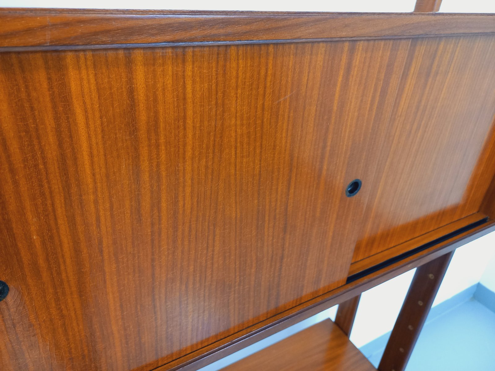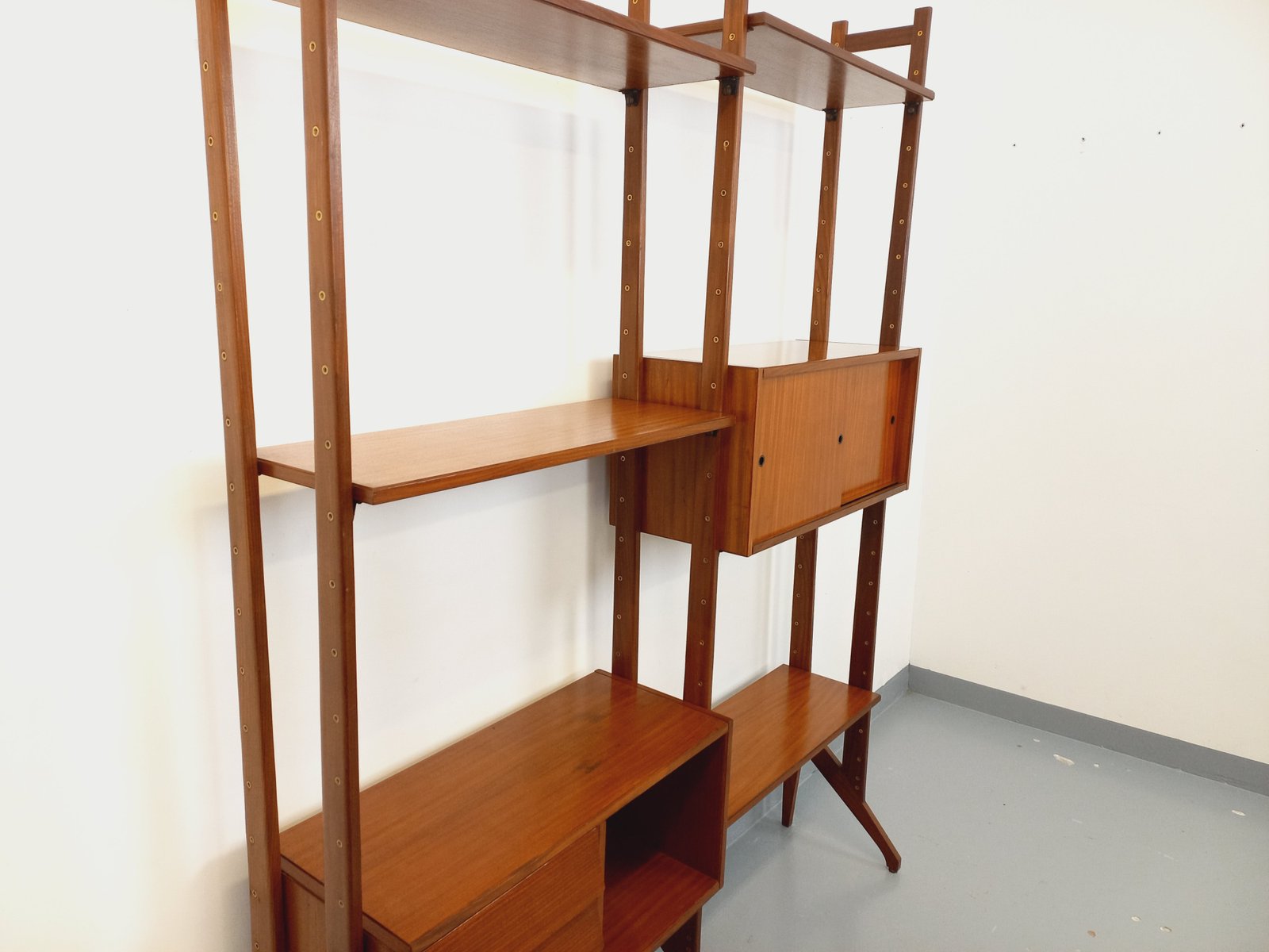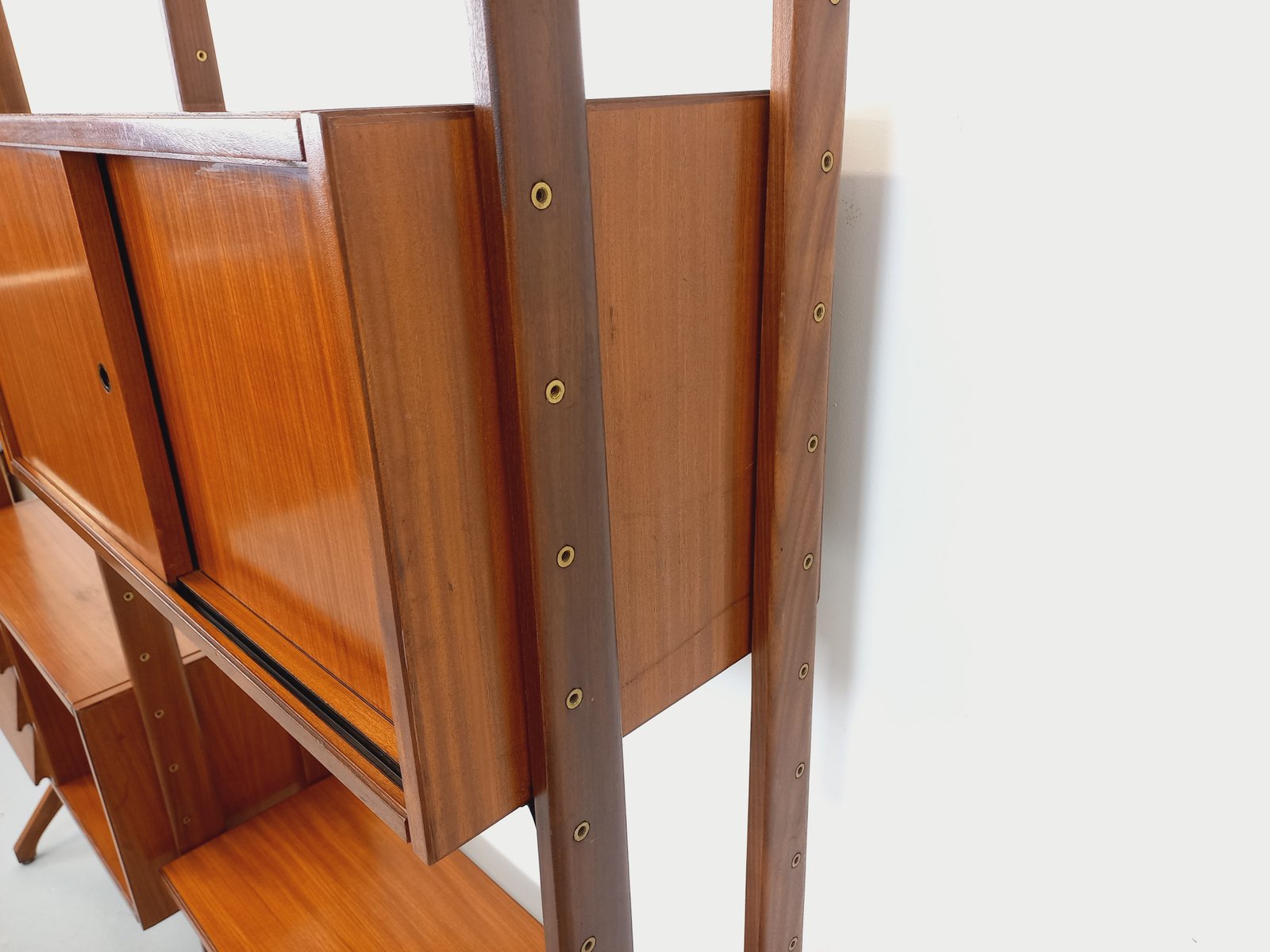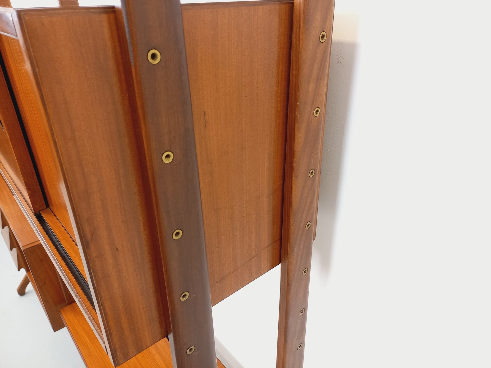 Zweiteiliges modulares Bücherregal im skandinavischen Stil aus den 1960er Jahren, schönes italienisches Design, aus Teakholz, mit freiliegenden Messingscheiben, verstellbaren Messingfüßen für die Anpassung an den Boden, 4 offene Regale, 1 Einheit mit 1 Nische und 3 Schubladen mit schrägem Design, 1 Modul mit 2 Schiebetüren. Das Element kann in der Mitte eines Raumes verwendet werden (die Rückseite des Elements ist attraktiv), insbesondere als Raumteiler. Sehr guter Gesamtzustand mit Anzeichen und Spuren des Alters.