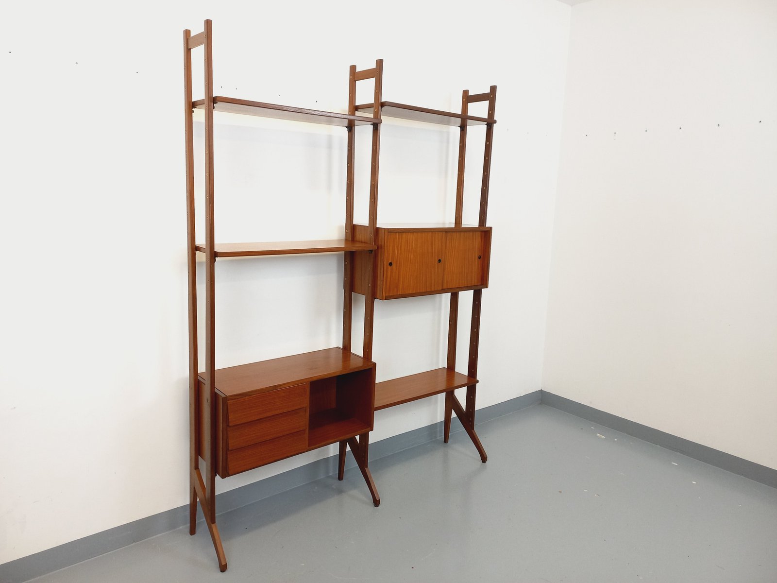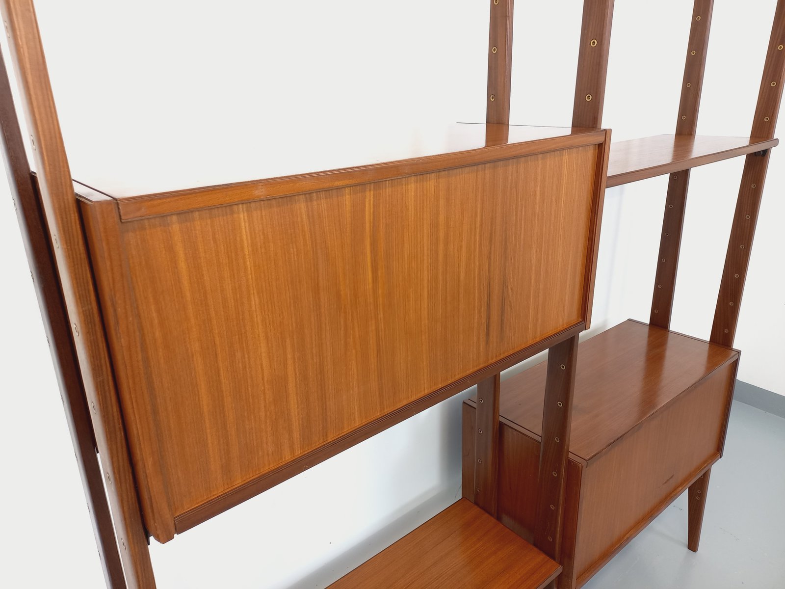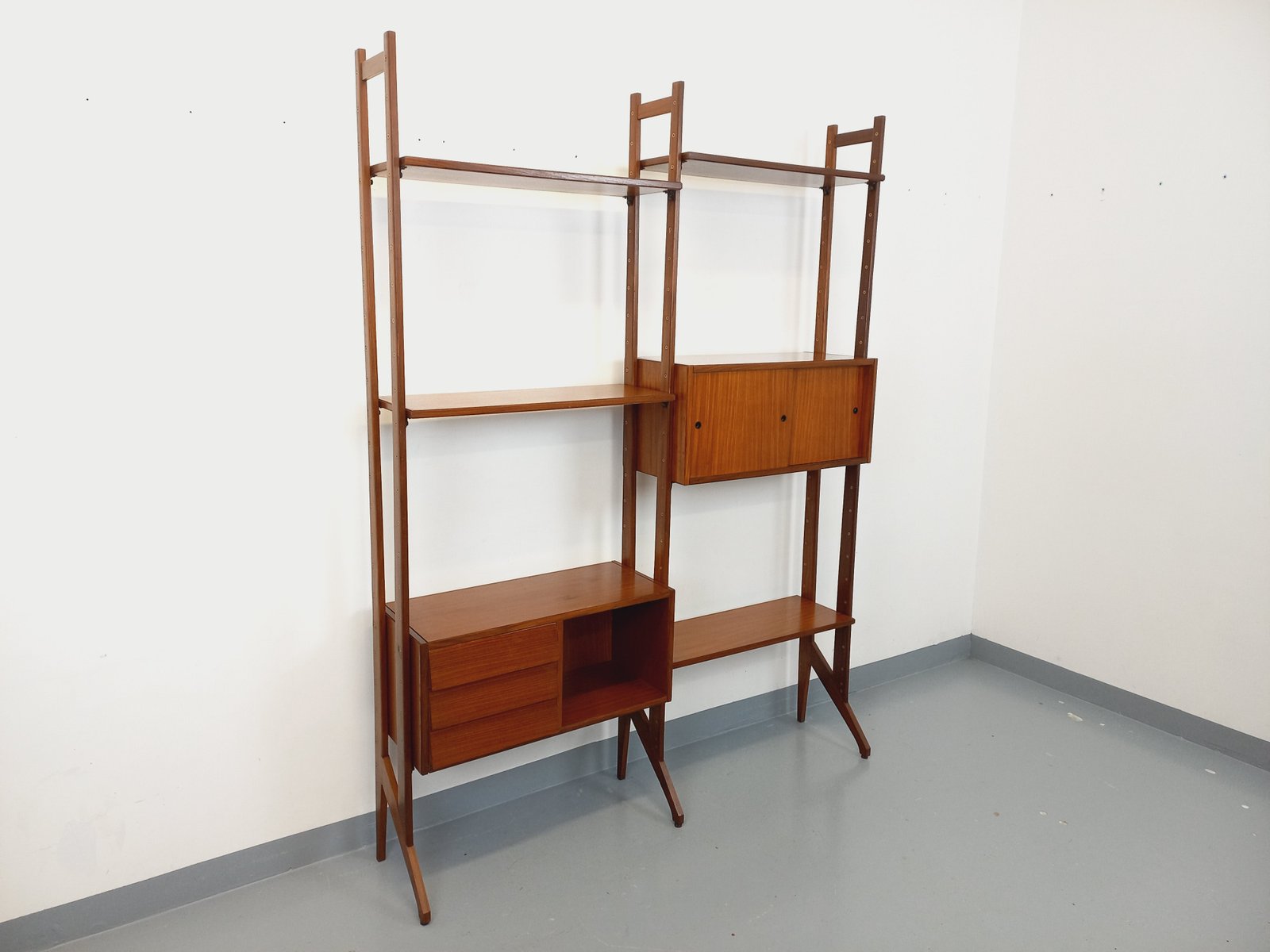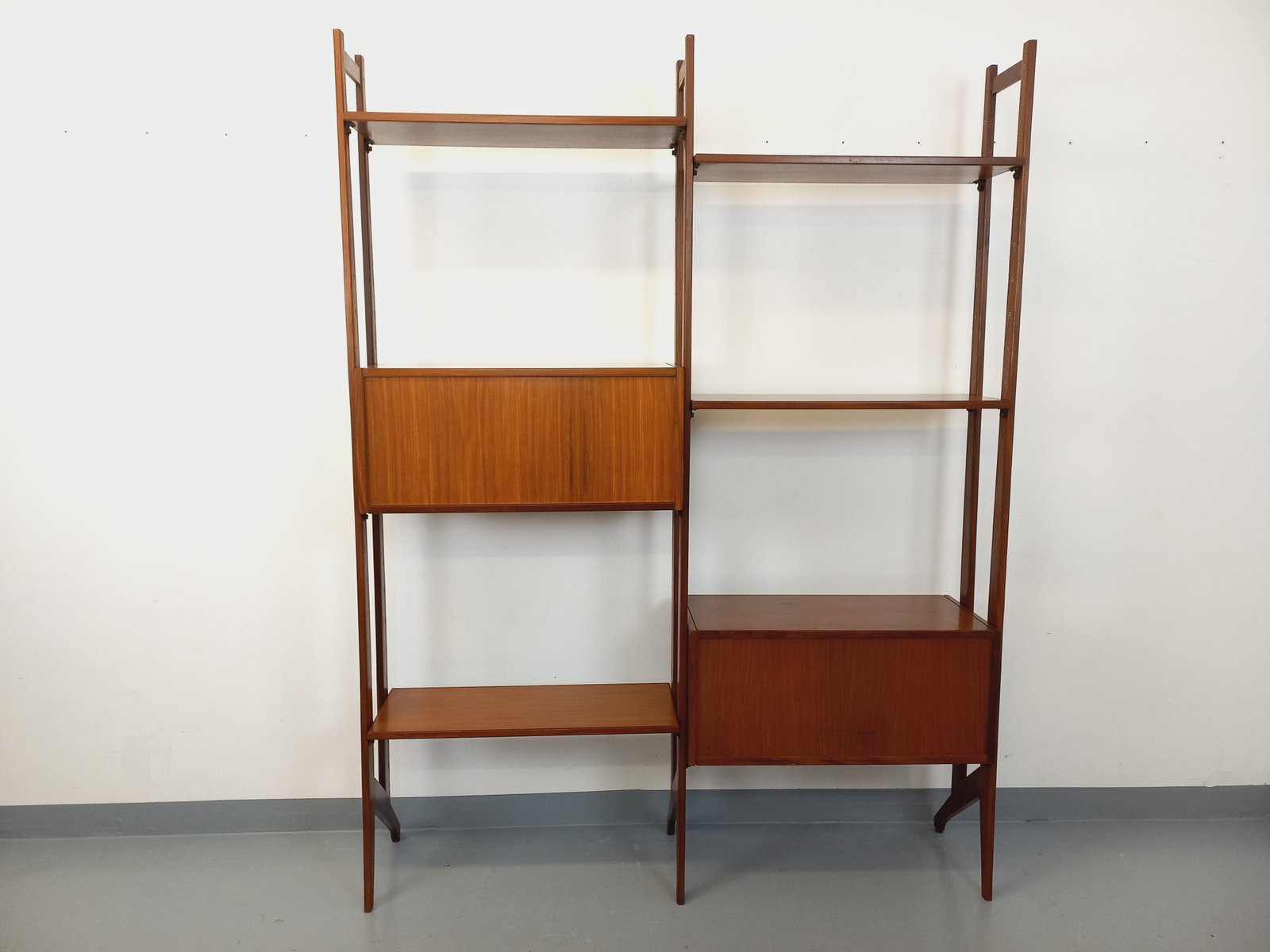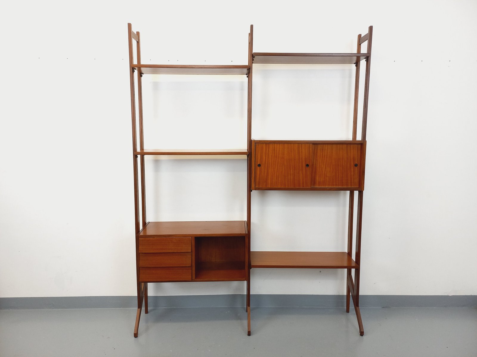 Zweiteiliges modulares Bücherregal im skandinavischen Stil aus den 1960er Jahren, schönes italienisches Design, aus Teakholz, mit freiliegenden Messingscheiben, verstellbaren Messingfüßen für die Anpassung an den Boden, 4 offene Regale, 1 Einheit mit 1 Nische und 3 Schubladen mit schrägem Design, 1 Modul mit 2 Schiebetüren. Das Element kann in der Mitte eines Raumes verwendet werden (die Rückseite des Elements ist attraktiv), insbesondere als Raumteiler. Sehr guter Gesamtzustand mit Anzeichen und Spuren des Alters.