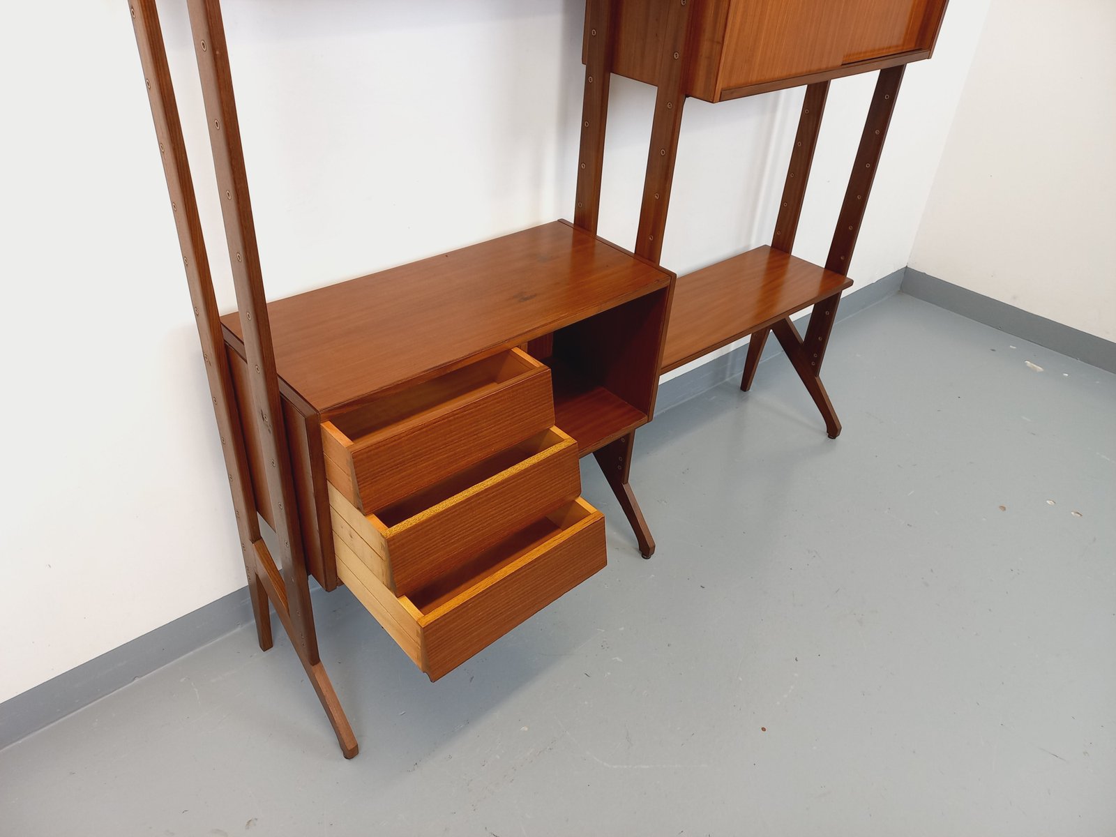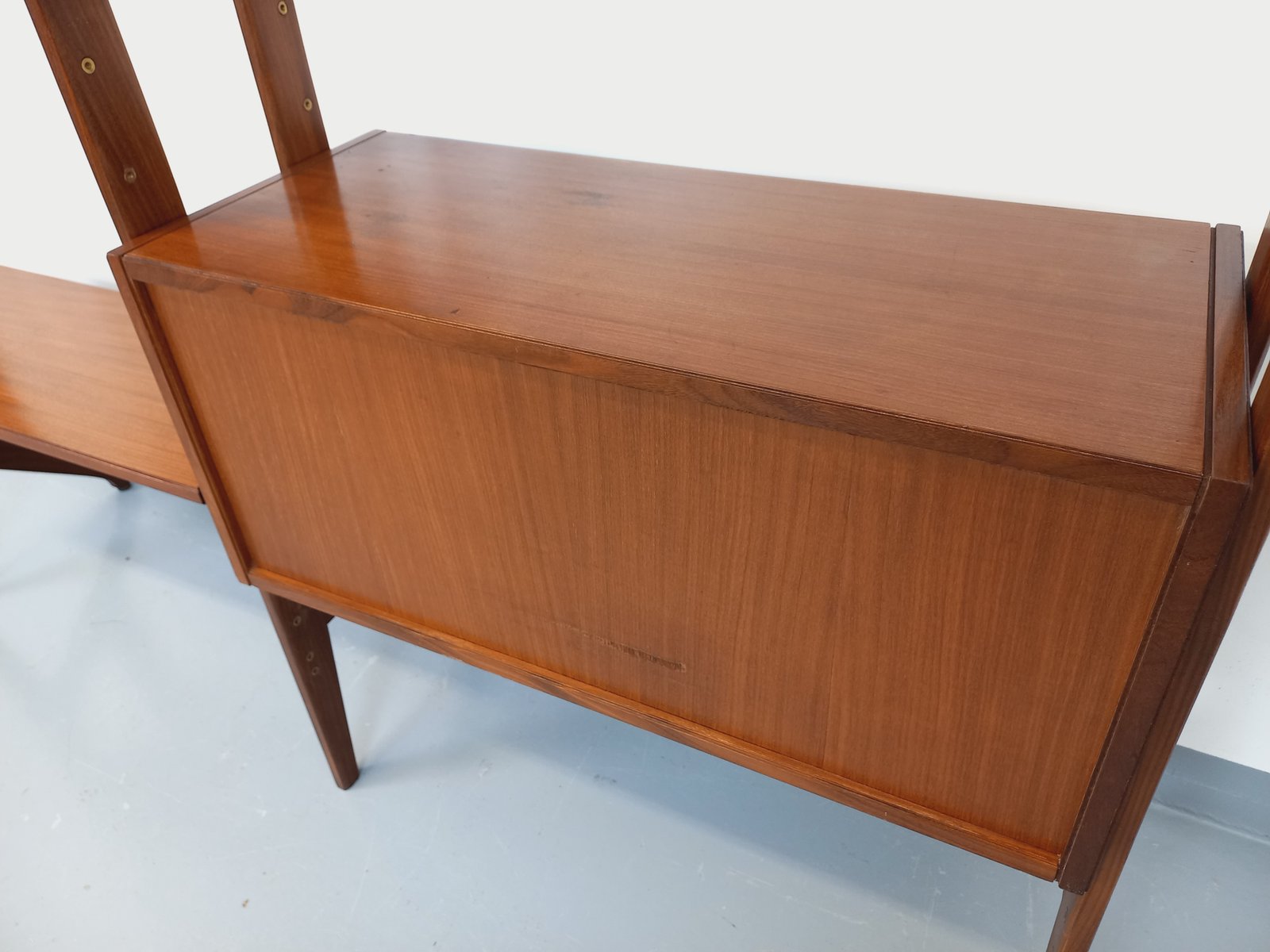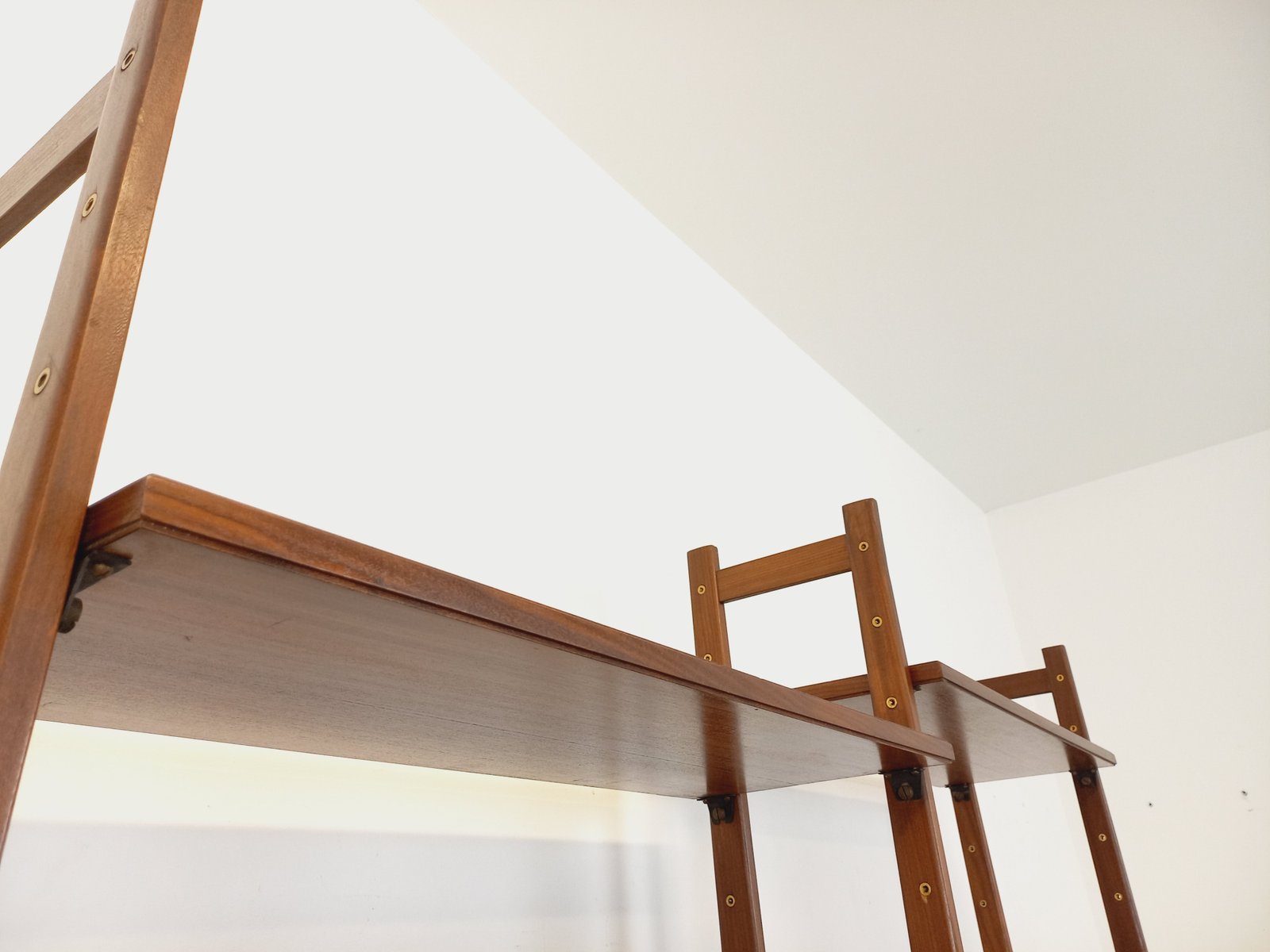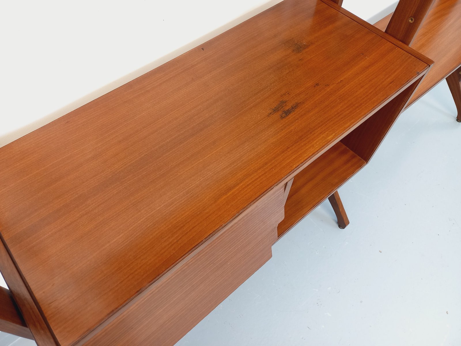 Zweiteiliges modulares Bücherregal im skandinavischen Stil aus den 1960er Jahren, schönes italienisches Design, aus Teakholz, mit freiliegenden Messingscheiben, verstellbaren Messingfüßen für die Anpassung an den Boden, 4 offene Regale, 1 Einheit mit 1 Nische und 3 Schubladen mit schrägem Design, 1 Modul mit 2 Schiebetüren. Das Element kann in der Mitte eines Raumes verwendet werden (die Rückseite des Elements ist attraktiv), insbesondere als Raumteiler. Sehr guter Gesamtzustand mit Anzeichen und Spuren des Alters.
