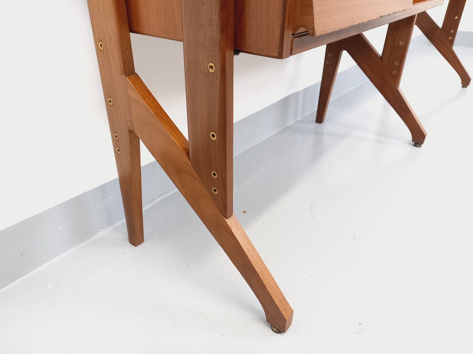 Vintage Scandinavian-style modular bookcase from the 1960s, in two parts, beautiful Italian design, in teak, with exposed brass washers, adjustable brass feet for floor-level adjustment, 4 open shelves, 1 unit with 1 niche and 3 drawers with a slanted design, 1 module with 2 sliding doors. The unit can be used in the center of a room (the back of the unit is attractive), especially as a room divider. Very good overall condition with signs and marks of age.