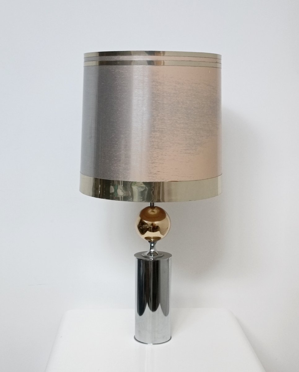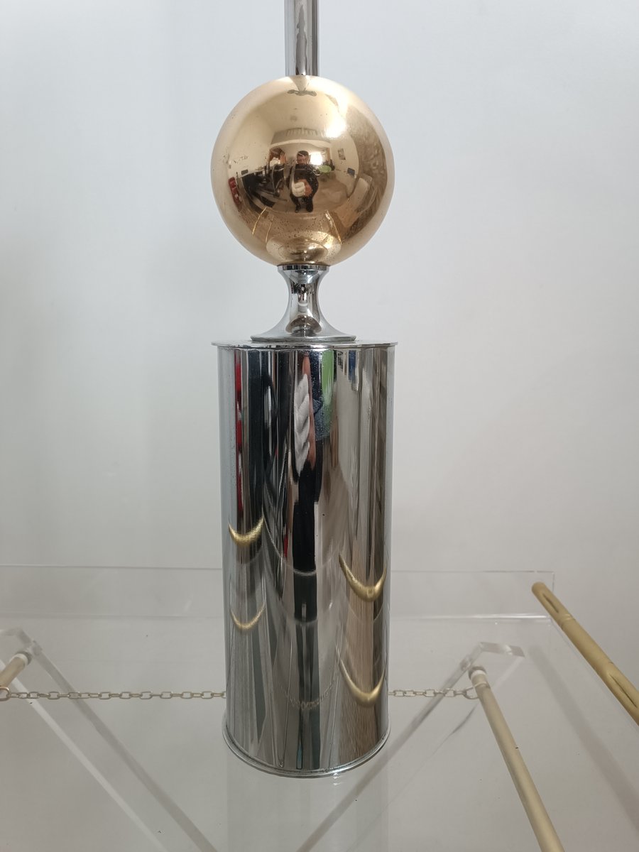 Wunderschöne Tischlampe von Philippe Barbier. Frankreich, 1960er Jahre. Zylindrische Struktur aus verchromtem Metall. Mit einer Messingkugel gekrönt.