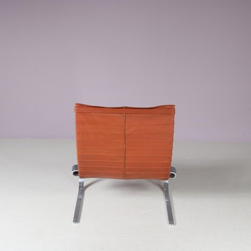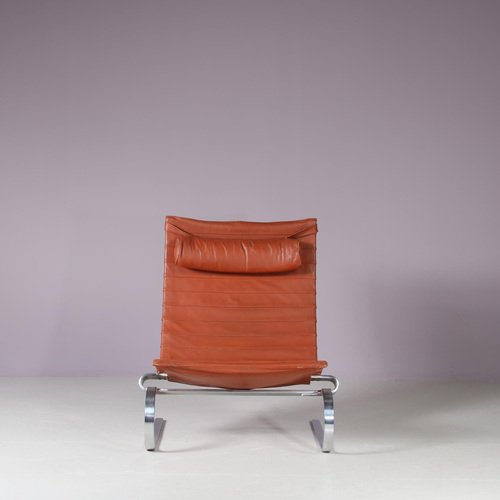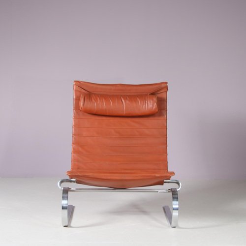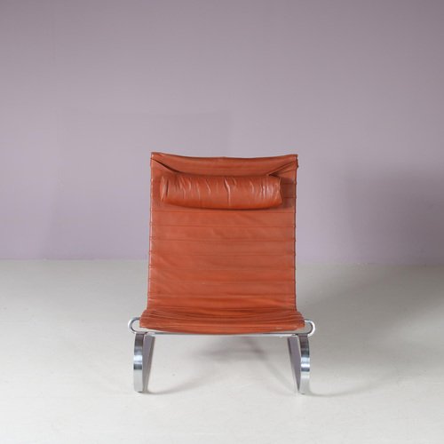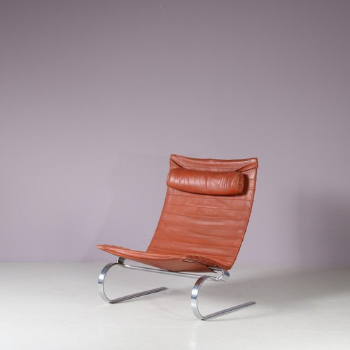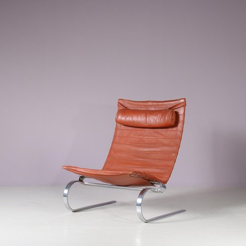 Ein wunderschöner PK20 Hochlehner-Sessel, entworfen von Poul Kjaerholm und hergestellt von E. Kold Christensen in Dänemark um 1960. Dieser sehr seltene Stuhl zieht garantiert die Aufmerksamkeit jedes Designliebhabers auf sich! Er hat ein wunderschönes verchromtes Metallgestell in einer elegant geschwungenen Form. Die Sitzfläche ist mit schönem cognacfarbenem Leder bezogen, das einen sehr schönen Kontrast zum hellen Material des Gestells bildet. Das zylindrische Nackenkissen ist mit demselben Material bezogen und verleiht diesem ohnehin schon sehr bequemen Stuhl zusätzlichen Komfort! Die leicht nach hinten geneigte Form und die niedrige Sitzfläche tragen zu einem angenehmen Sitzerlebnis bei. Der Stuhl hat die Herstellermarke in den Rahmen geschnitzt, wie auf den Fotos zu sehen ist. Auch das Etikett des berühmten Auktionshauses Bruun Rasmussen, bei dem der Vorbesitzer das Stück erworben hat, ist noch am Rahmen befestigt! Es bleibt in sehr gutem, Vintage-Zustand mit geringem Verschleiß im Einklang mit Alter und Gebrauch, die Erhaltung einer schönen Patina!