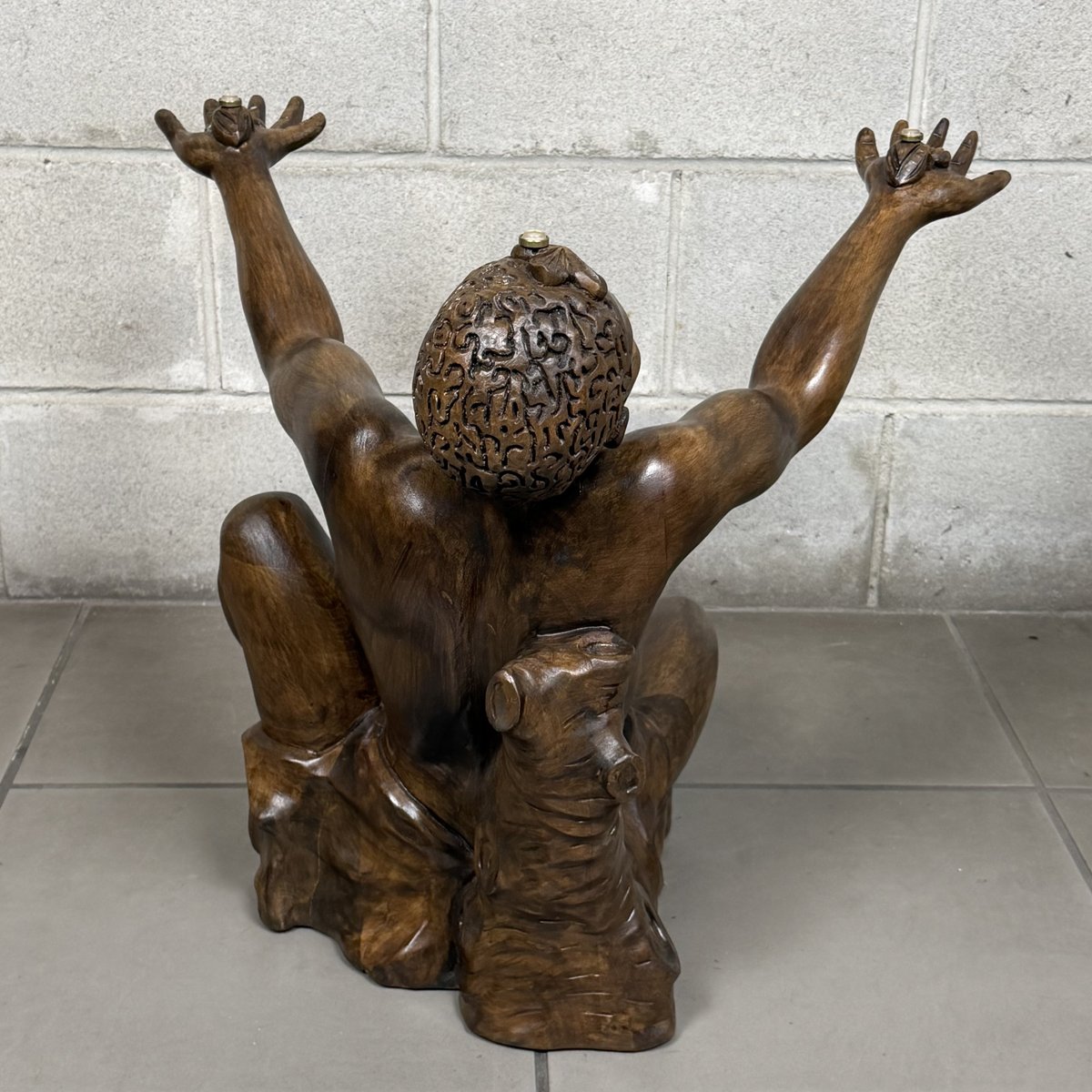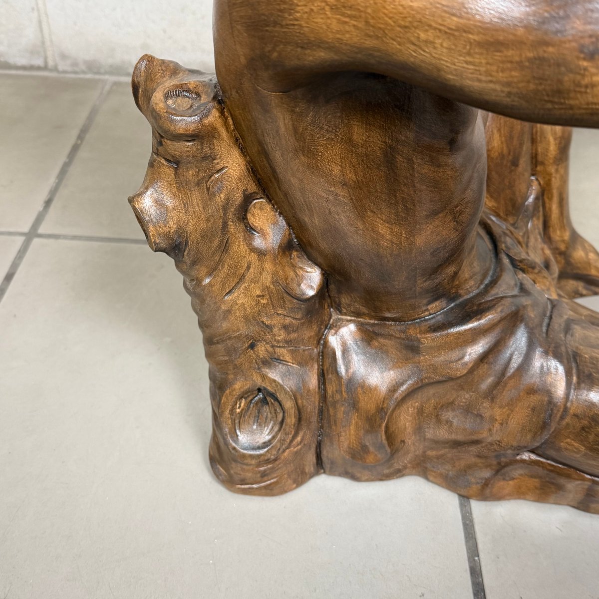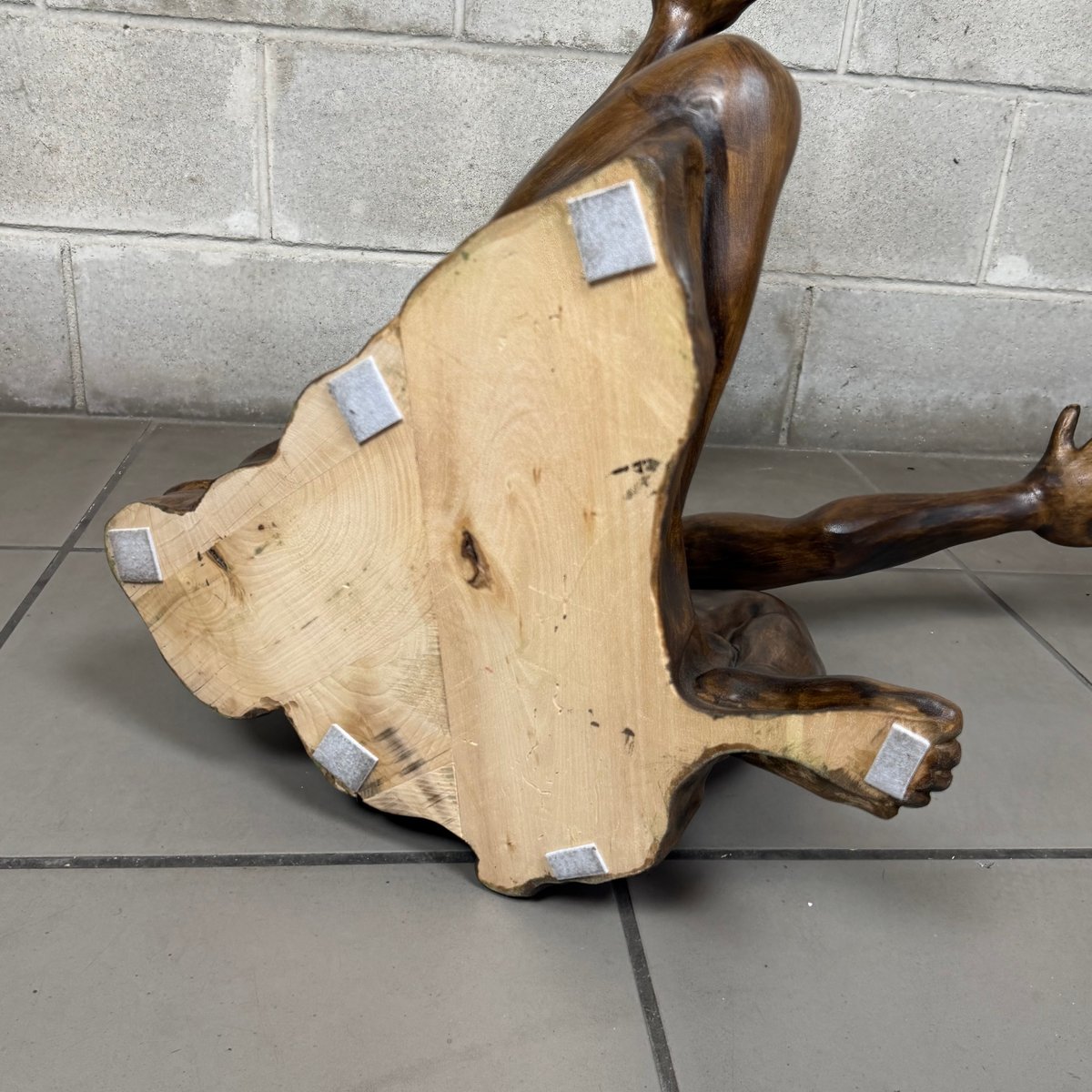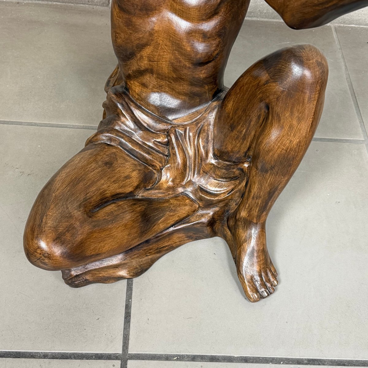 Design and Sculpture: The base is made of a solid wood statue carved in the round, depicting a kneeling male figure (Atlas). The pose is dynamic and expressive: the man gazes upward and raises his arms to support the tabletop, creating an impression of both lightness and strength. The sculpture is crafted with great mastery, evident in the definition of the muscles, facial features, and the drapery covering the hips. The wood has a dark, glossy finish that enhances its volumes.