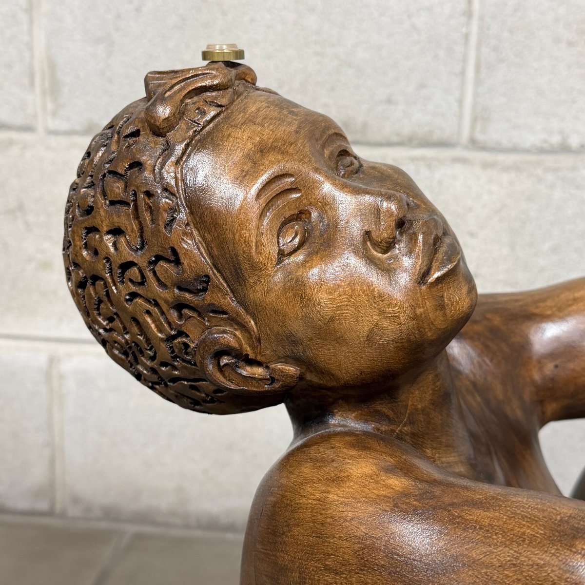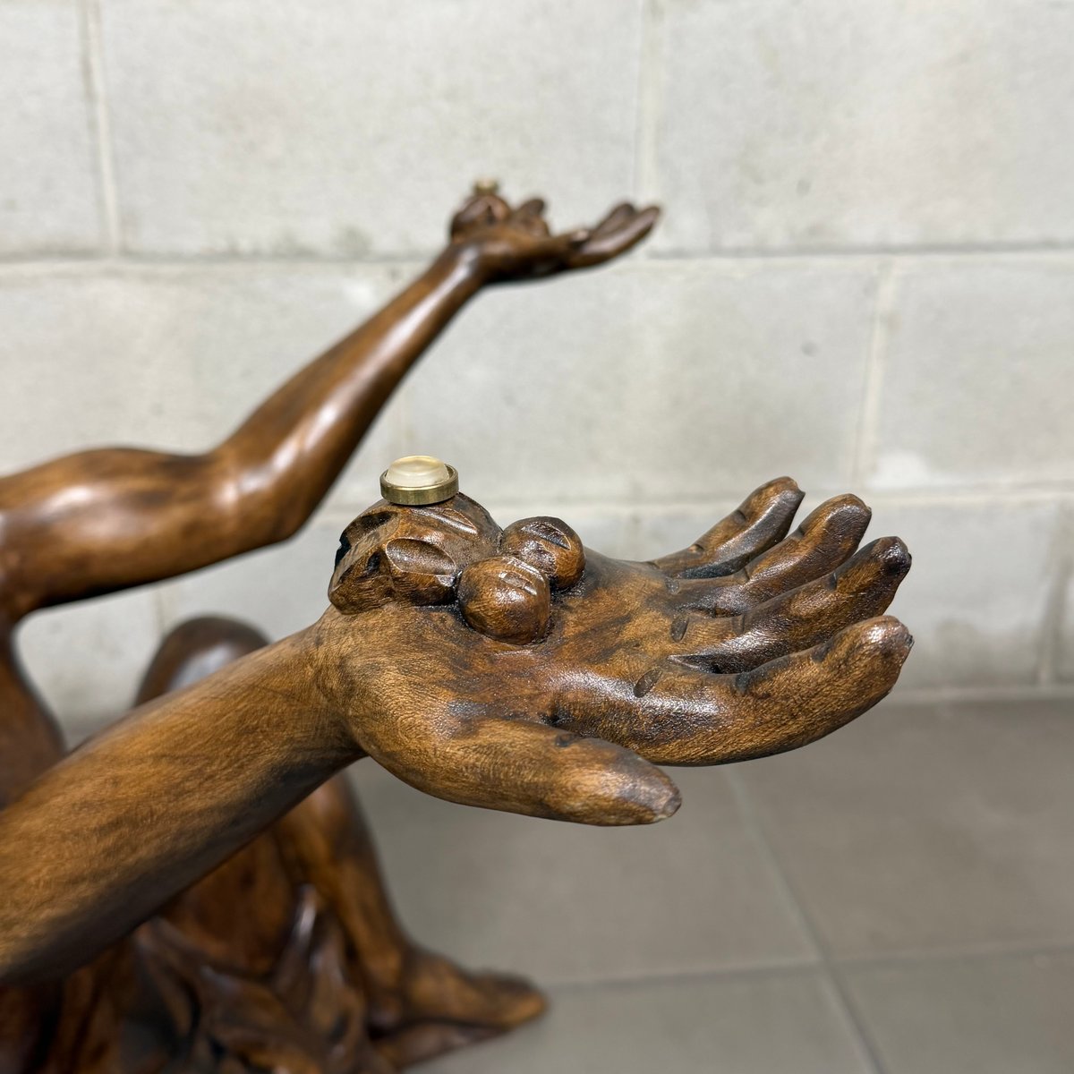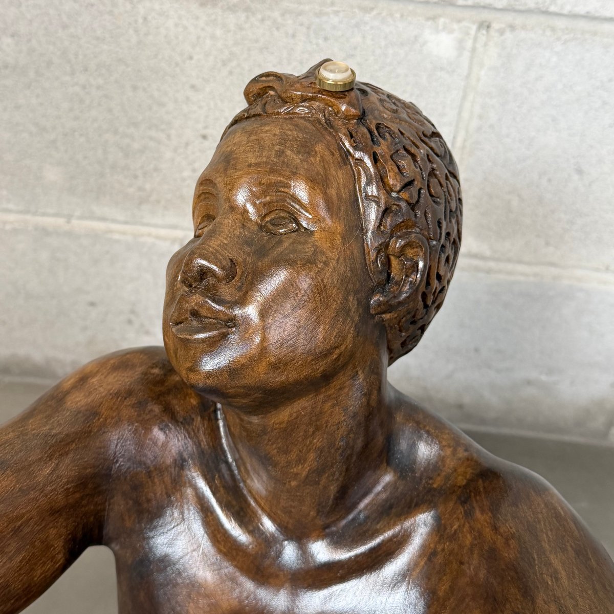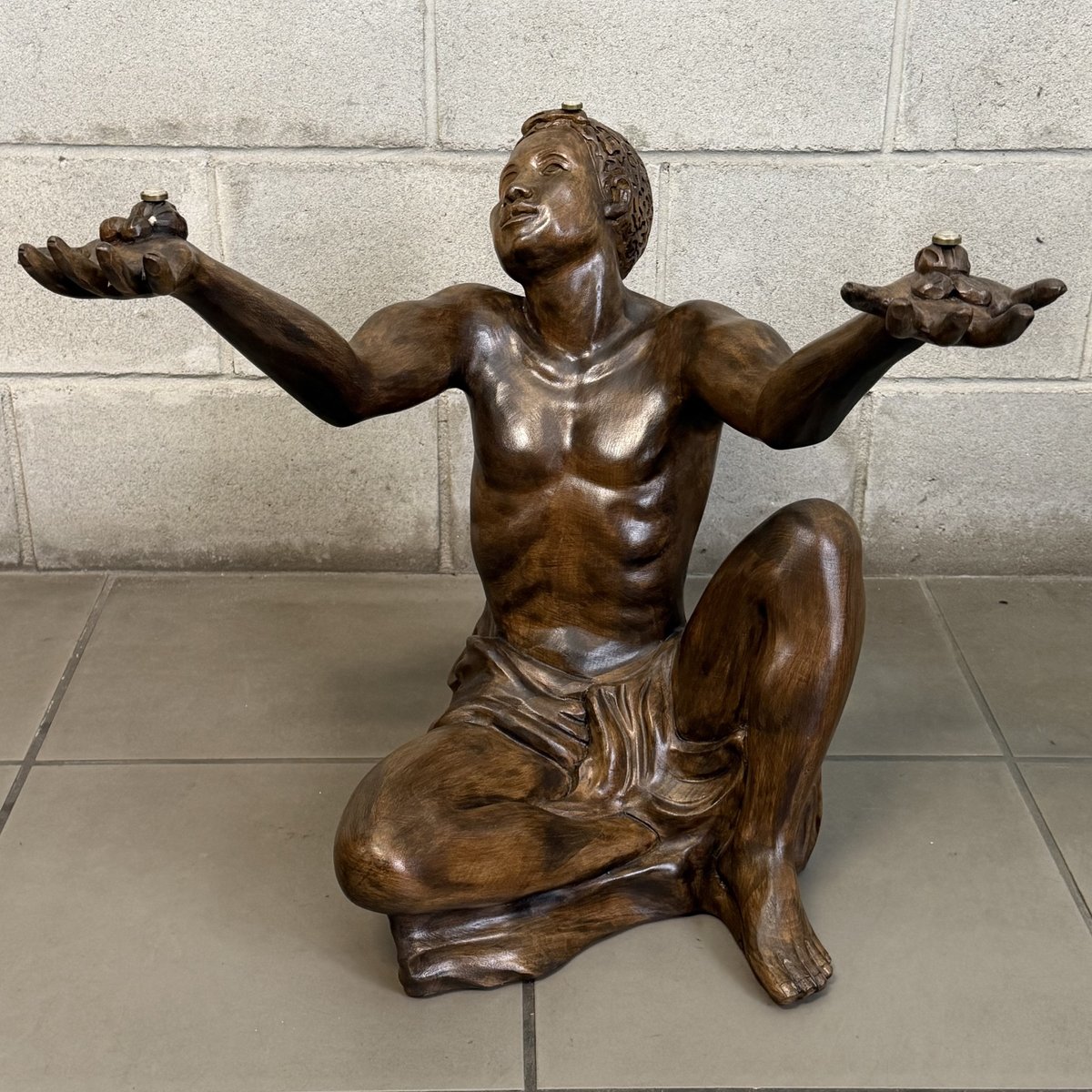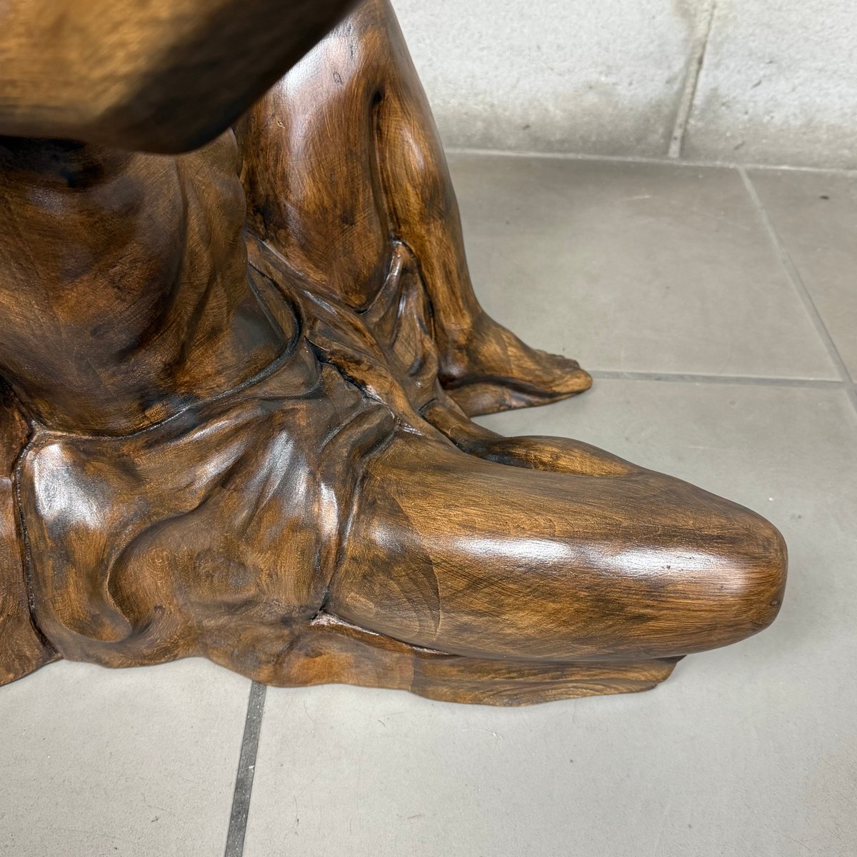 Design and Sculpture: The base is made of a solid wood statue carved in the round, depicting a kneeling male figure (Atlas). The pose is dynamic and expressive: the man gazes upward and raises his arms to support the tabletop, creating an impression of both lightness and strength. The sculpture is crafted with great mastery, evident in the definition of the muscles, facial features, and the drapery covering the hips. The wood has a dark, glossy finish that enhances its volumes.
