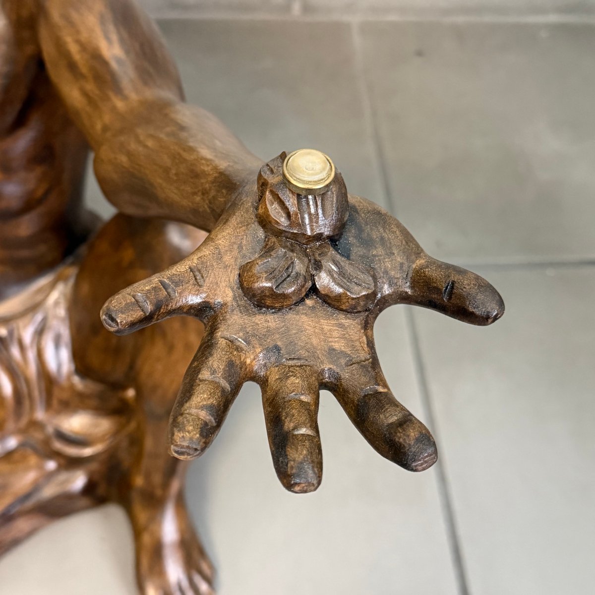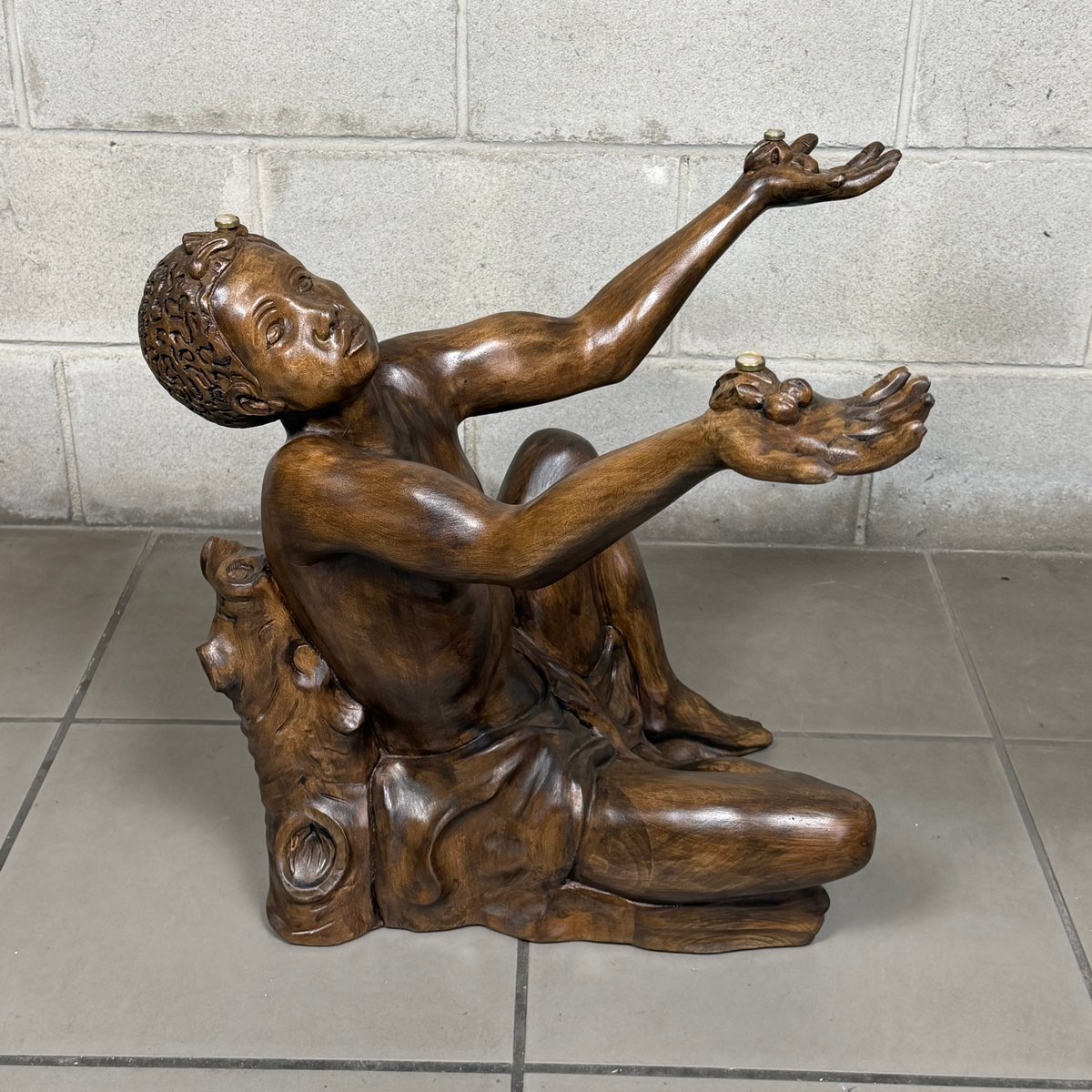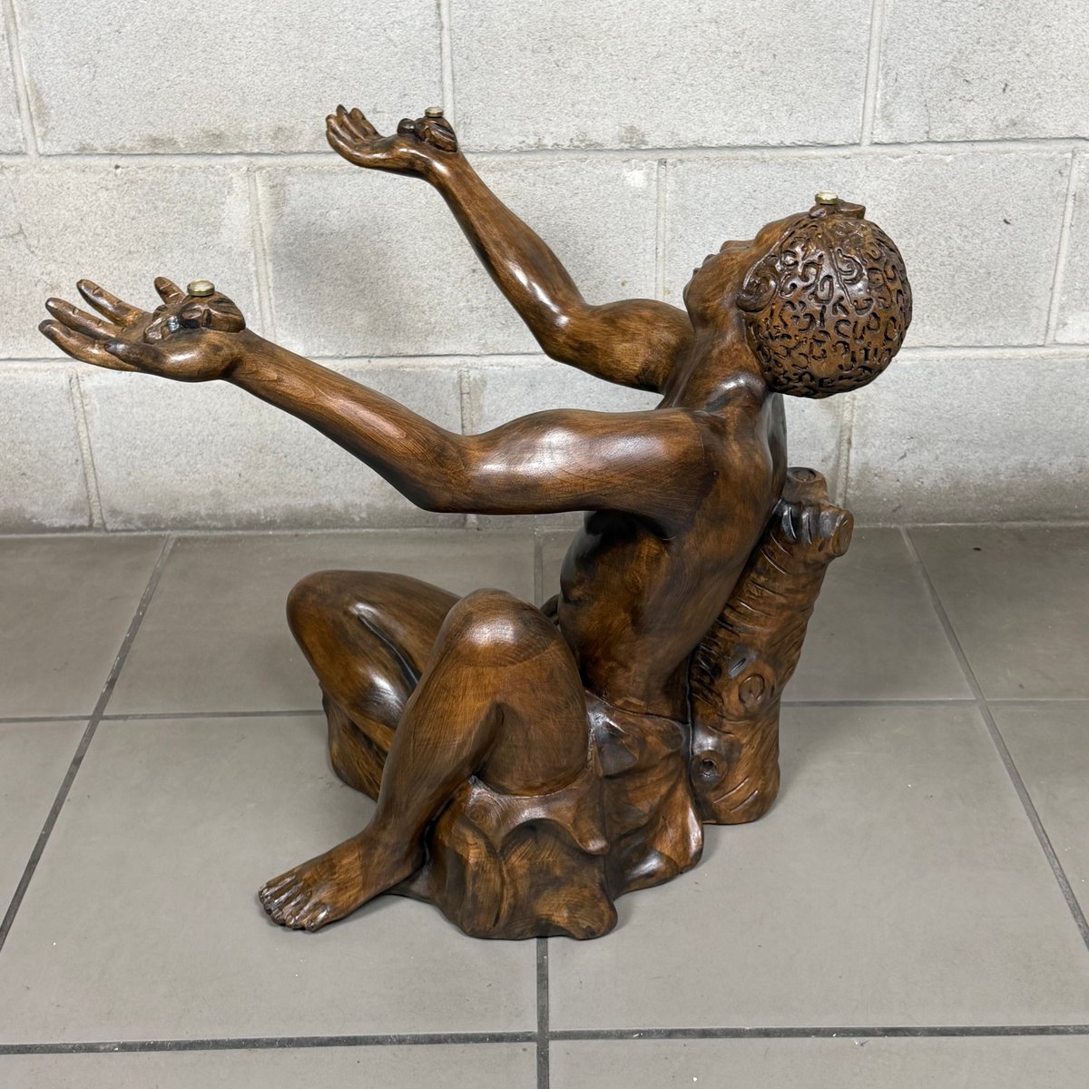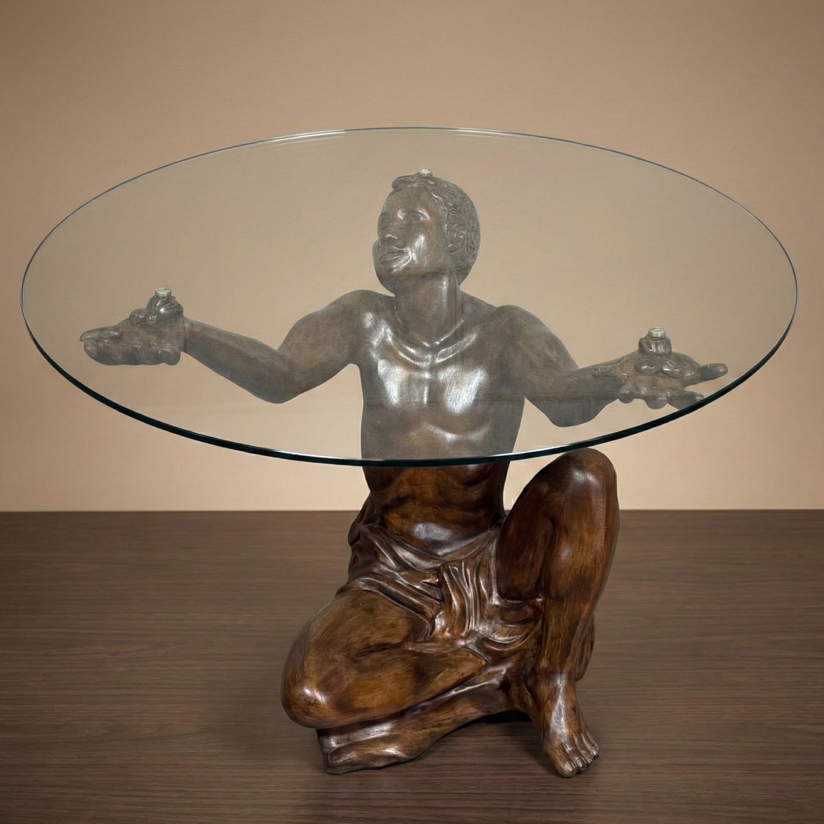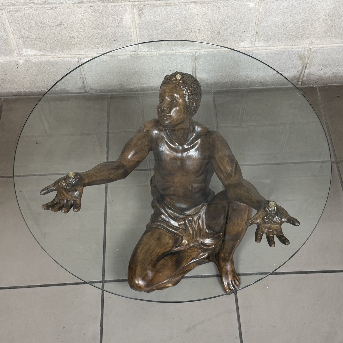 Glasplatte: Die Figur trägt eine großzügig dimensionierte runde Glasplatte (Durchmesser 75 cm). Das Glas ruht auf dezenten Stützen, die an den Händen und am Kopf der Statue angebracht sind. Bitte beachten Sie, dass das Glas in ausgezeichnetem Zustand (praktisch neu) ist und keine Kratzer oder Flecken aufweist, die seine Transparenz beeinträchtigen könnten. Technische Details und Zustand: · Typ: Skulpturaler Couchtisch.
