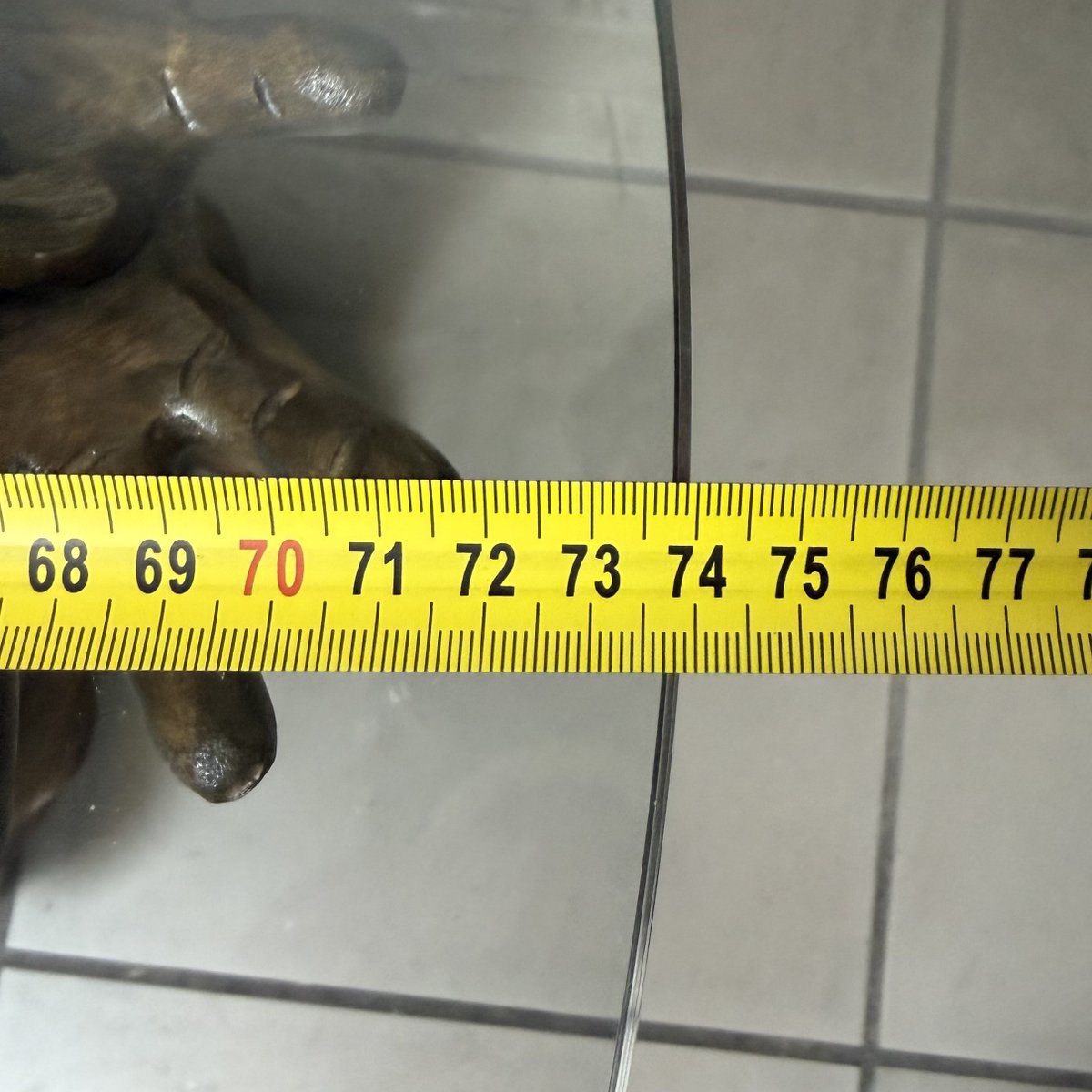 Glass Top: The figure supports a generously sized round glass top (diameter 75 cm). The glass rests on discreet supports positioned on the statue's hands and head. Please note that the glass is in excellent condition (practically new), with no scratches or marks that could compromise its transparency.