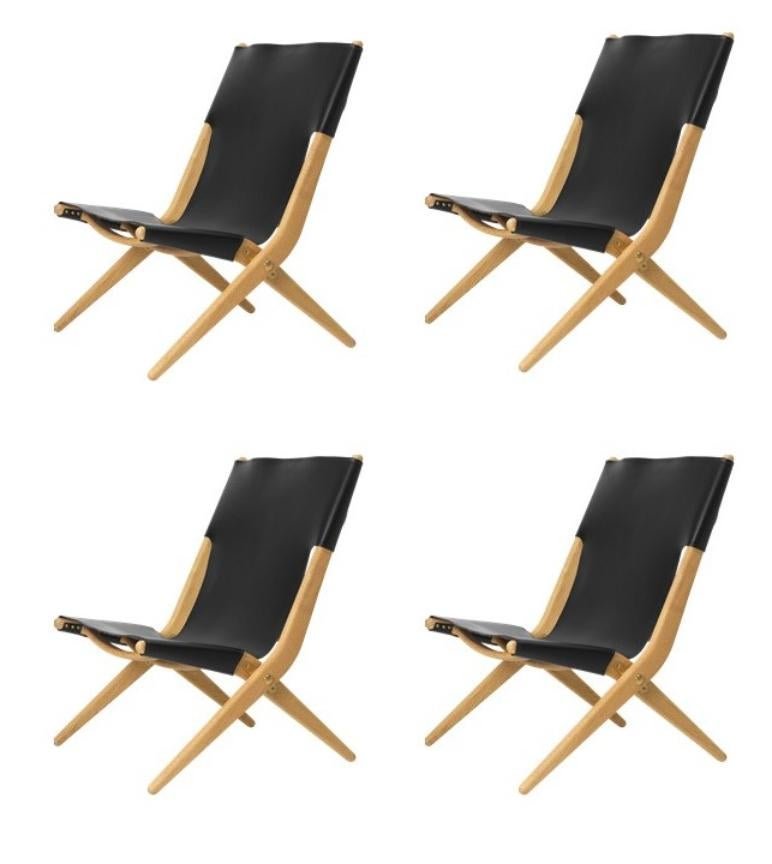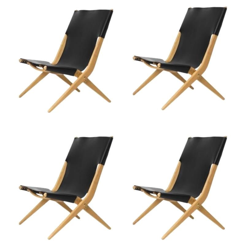 Set of 4 natural oiled oak and black leather saxe chairs by Lassen Dimensions: W 60 x D 67 x H 84 cm Materials: leather, oak. Mogens Lassen was perceived as ‘the naughty boy in class’, but he aimed for perfection in each design project. His eye for detail, leaving nothing unnoticed, and his will to try out new methods are clearly seen in this characteristic and timeless chair. It is contemporary proof of his habit of pushing the boundaries of materials and what was comme il faut. The seat, manufactured in core leather, truly reaches the limits of how big pieces of leather can be and are enhanced by the moulded, yet massive wooden legs. In the middle of the 20th century, this technique was still in its early years. The beautiful fittings work almost as a piece of jewellery on the chair and clearly illustrate how only the finest materials were selected. Mogens Lassen’s Saxe chair is a classic example of aesthetics and functionality enhancing one another.