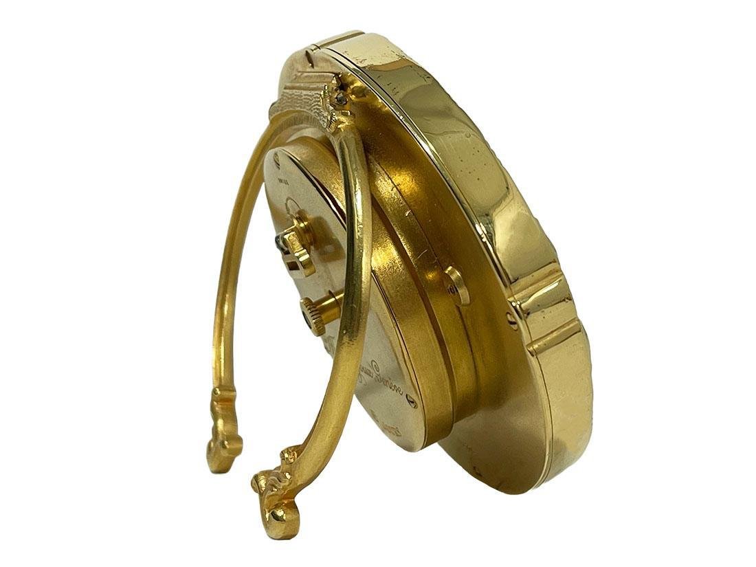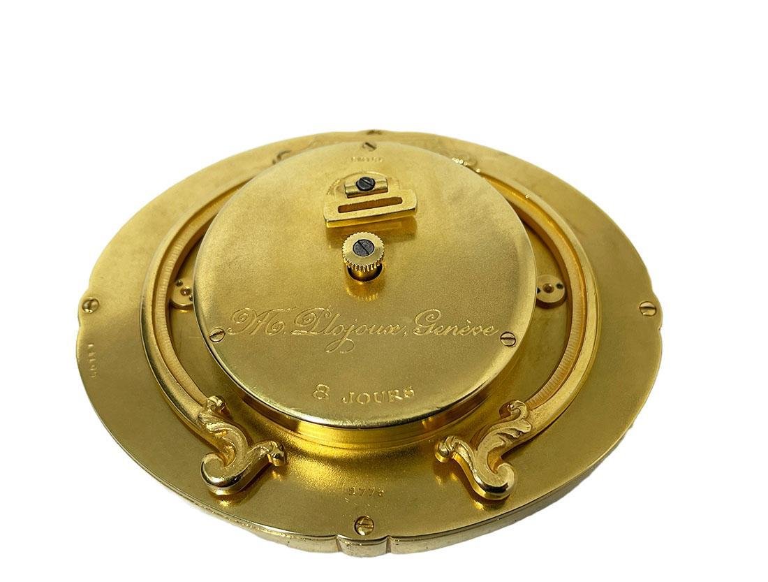 Eine ovale Schweizer Tischuhr, hergestellt von Michel-Ange Plojoux, Genf. Das Zifferblatt flankiert von einer gemalten Schweizer Seelandschaft (signiert) hinter facettiertem Glas und hat arabische Ziffern. Eine 8-Stunden-Uhr mit Unruhhemmung. Die Uhr ist nummeriert mit 14105 und 1775. Gezeichnet mit M.A. Plojoux (Michel-Ange Plojoux), Genève. Auf der Rückseite eine Rocaille-Staffelei. 1 Schraube fehlt auf der Rückseite und weist einige Gebrauchsspuren auf. Die Höhe ist 7 cm, die Breite ist 9 cm, und 5 cm tief stehen. Das Gewicht beträgt 300 Gramm M. A. Plojoux war in der Rue du Rhône 30 in Genf ansässig. Er war ein hochpräziser Uhrmacher, spezialisiert auf Komplikationsuhren und Schmuck. Er erhielt zwei Auszeichnungen auf der Pariser Weltausstellung 1878, gewann 1880 eine Goldmedaille und nahm auch an der Genfer Nationalausstellung 1896 teil.