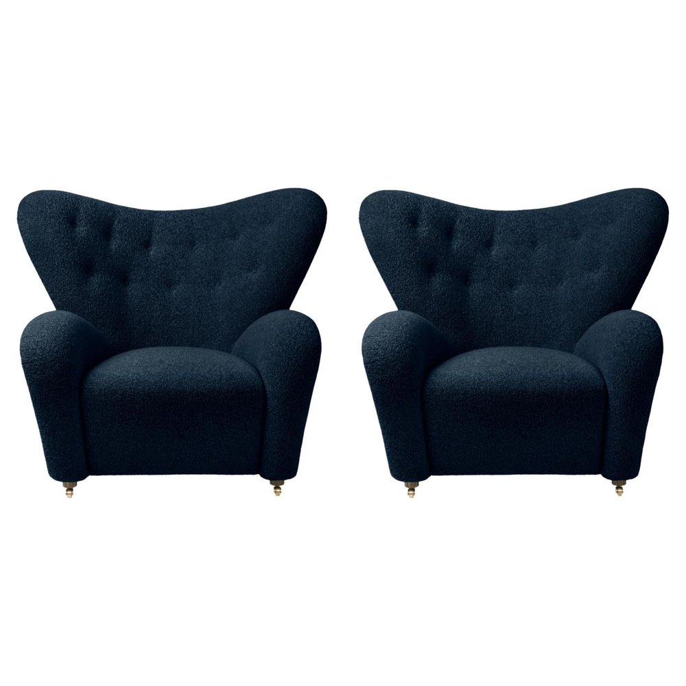 Set of 2 blue Sahco Zero the tired man lounge chairs by Lassen Dimensions: W 102 x D 87 x H 88 cm Materials: Sheepskin Flemming Lassen designed the overstuffed easy chair, The Tired Man, for The Copenhagen Cabinetmakers’ Guild Competition in 1935. It is characterised by organic, bearlike shapes and then as now it created a sensation with its curved form and voluminous armrests. Sitting in the chair should, in Flemming Lassen’s own ords, be ”as warm and safe as a polar bear cub in the arms of its mother in the middle of the ice cap”. The family man Flemming Lassen valued intimate relationships - with its warm exterior, The Tired Man invokes domestic cosiness and socialising by candlelight. By Lassen is a Danish design brand focused on iconic designs created by Mogens and Flemming Lassen, founded by Lassens’ relatives in 2008.
