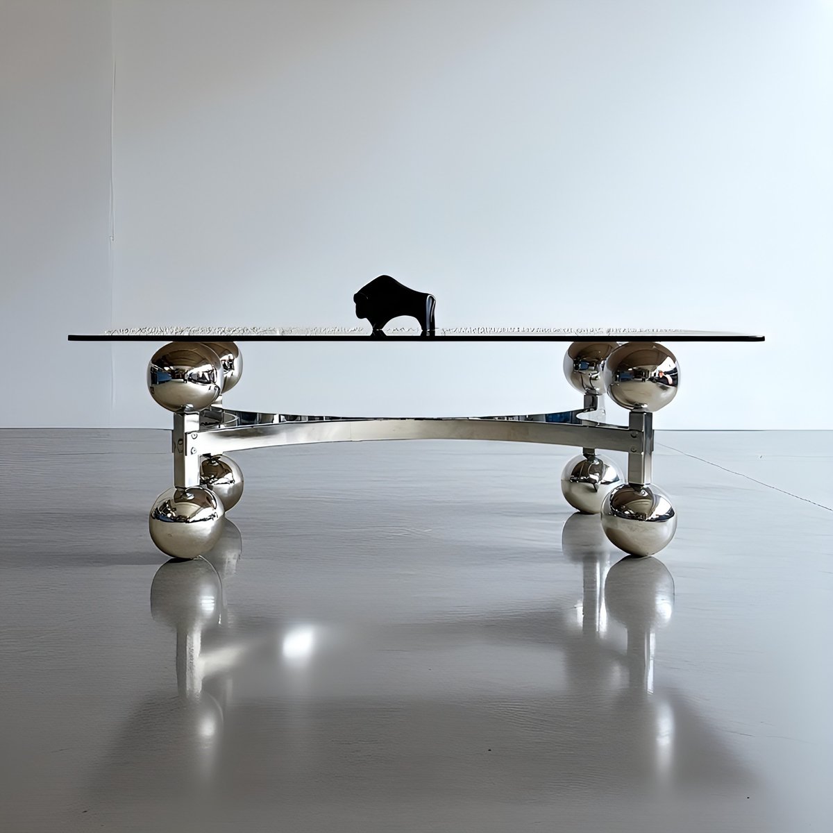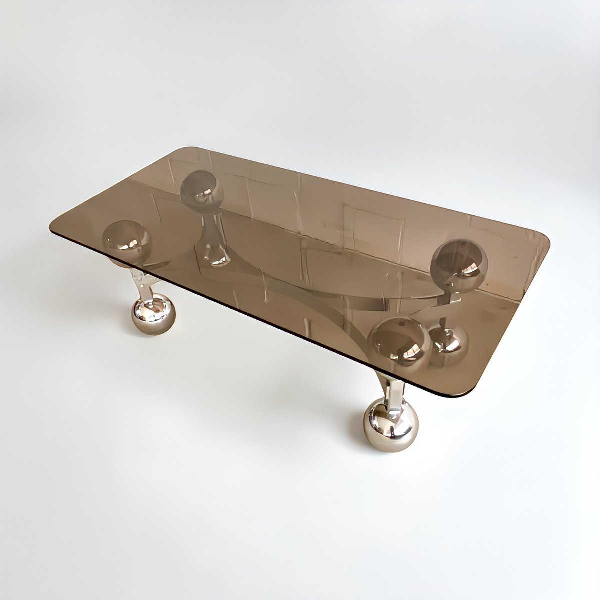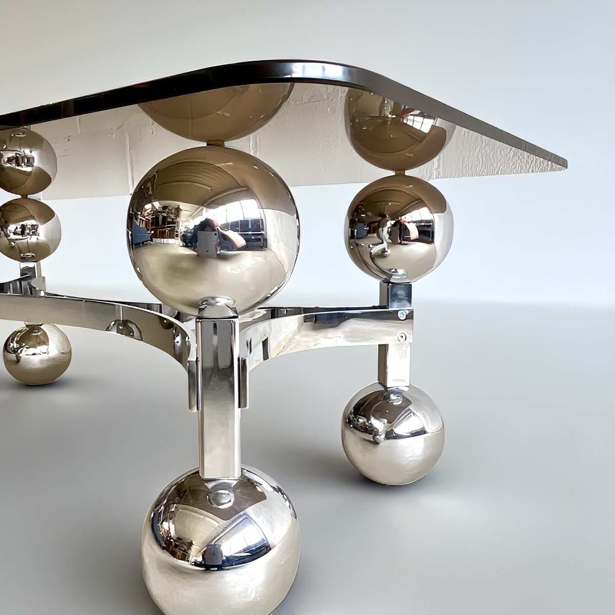 * The Space Age Atomic coffee table, the base (resembling an art object), consists of eight chrome-plated metal spheres connected by thick flat steel.