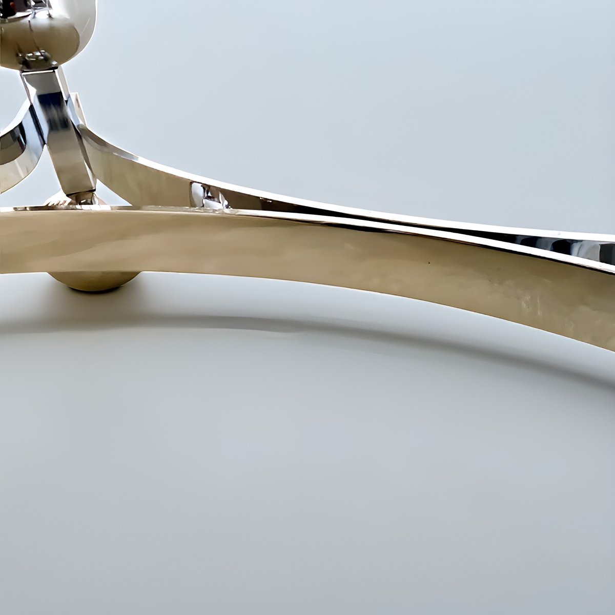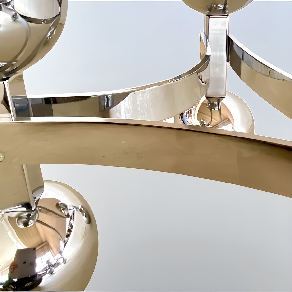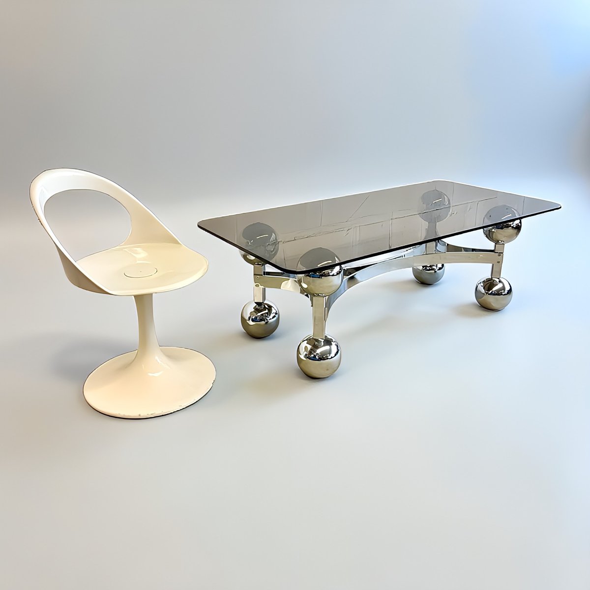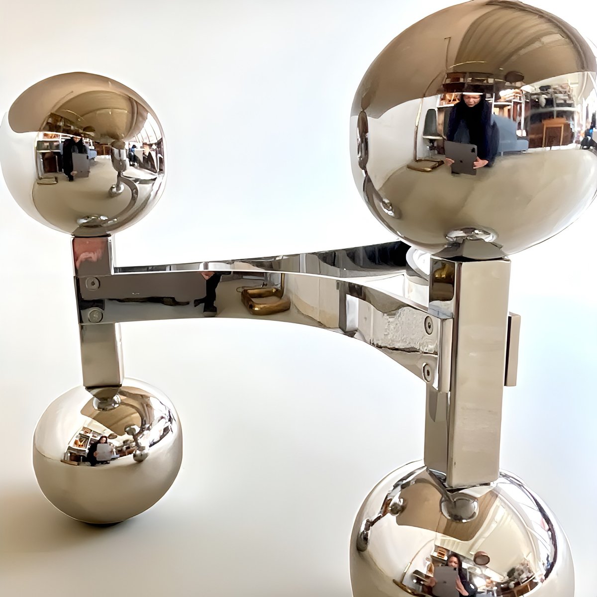 * The Space Age Atomic coffee table, the base (resembling an art object), consists of eight chrome-plated metal spheres connected by thick flat steel.