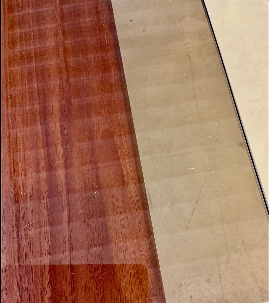 + Diese sind am Glas sehr wenige, kleine Oberflächen-Kratzer und wenige, sehr winzige Bestossungen - kantig ( siehe die letzten zwei Fotos oben, wir haben die Glas-Platte auf einem Holztisch gelegt - deshalb ist der Untergrund teils bräunlich , damit man die Kratzer auf den Bildern besser erkennen kann ).