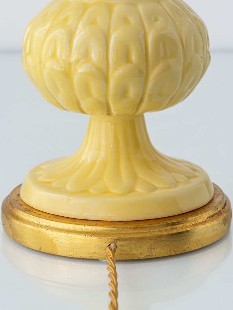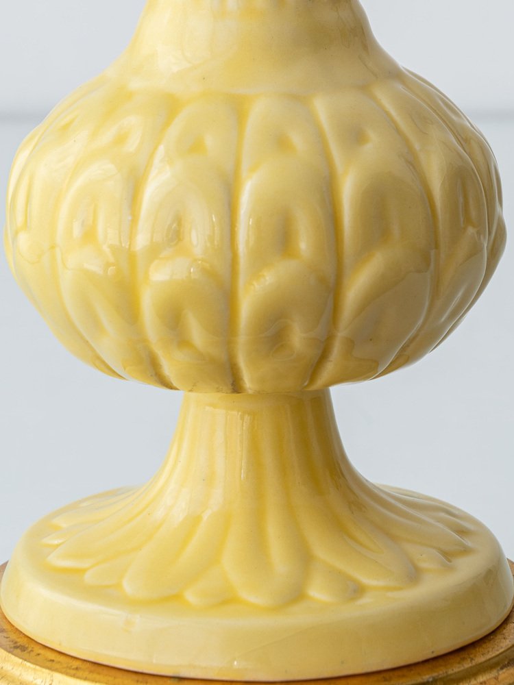 A stunning marriage of Spanish mid-century ceramics and English textile artistry. This vintage Manises ceramic lamp base dates from the 1950s-1970s and features butter-yellow glazed ceramic with a fluted column and sculptural bulbous detail—hallmarks of the historic Valencian pottery tradition.