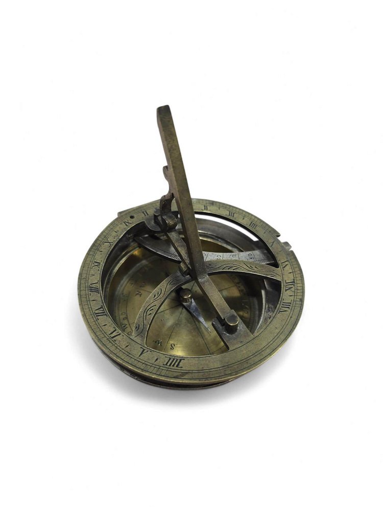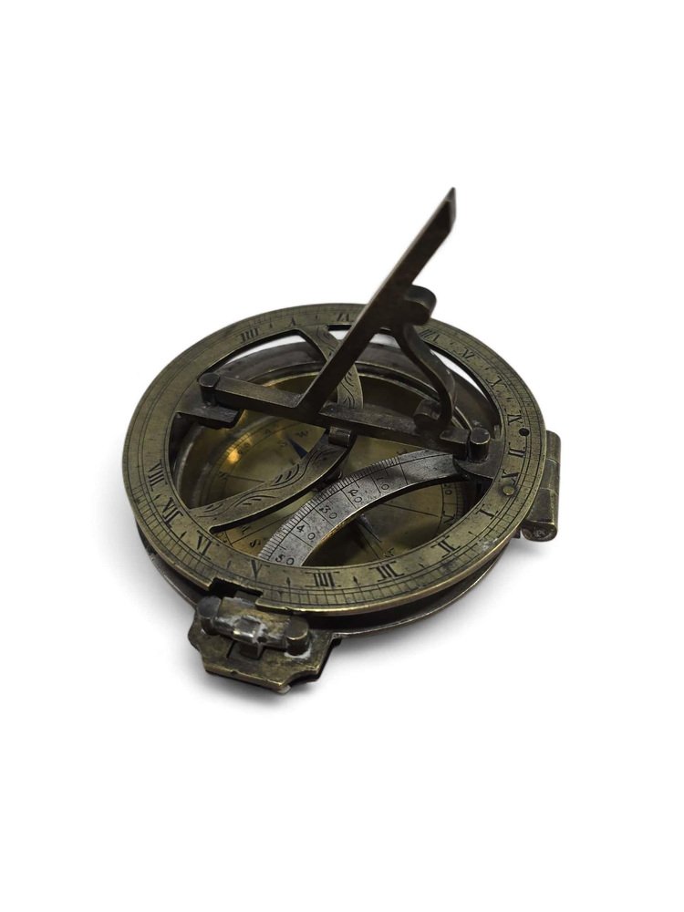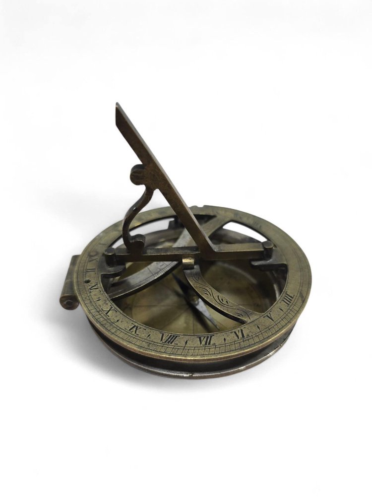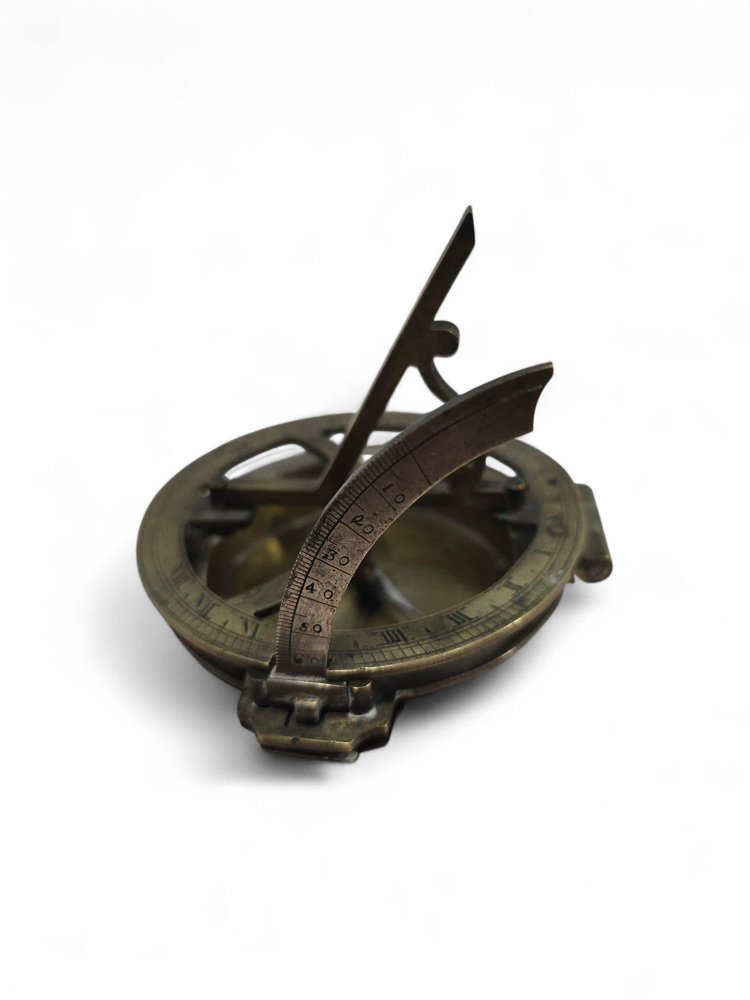 Elegant 19th-century portable sundial crafted in bronze, partially silvered and finely engraved with precise calibrations and decorative detailing. This compact timekeeping instrument reflects the technical skill and aesthetic refinement characteristic of 19th-century European scientific craftsmanship. Its combination of silvered and gilt surfaces enhances both legibility and visual appeal, making it a beautiful example of the period’s functional yet ornamental design.