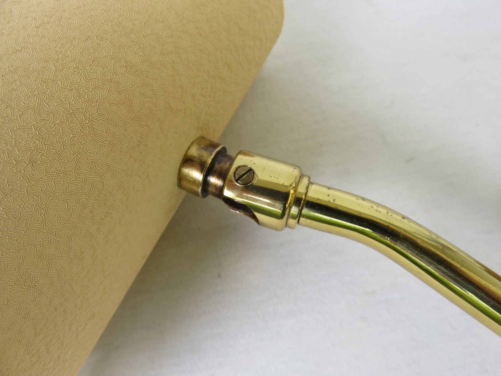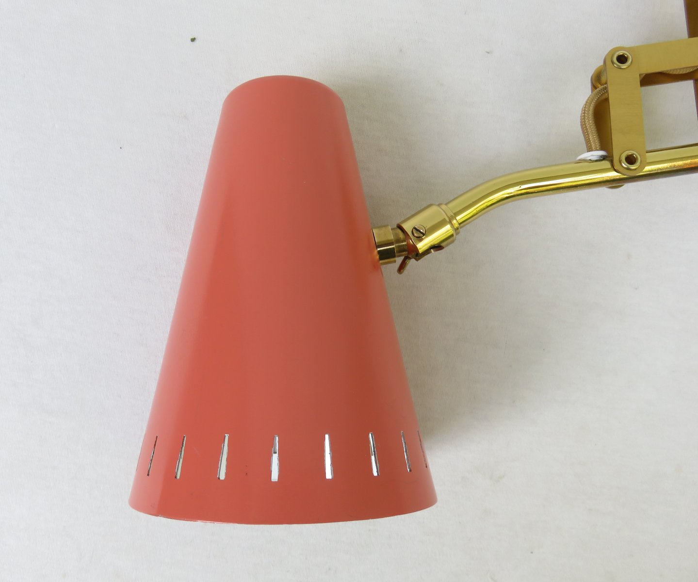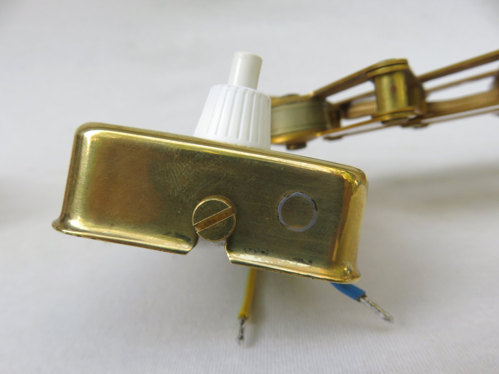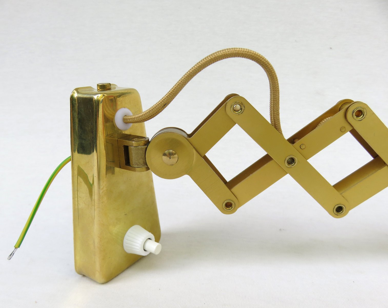 Die Wandhalterungen sind aus Messing, die Scheren goldfarben eloxiert, die Lampenschirme Aluminium lackiert.
