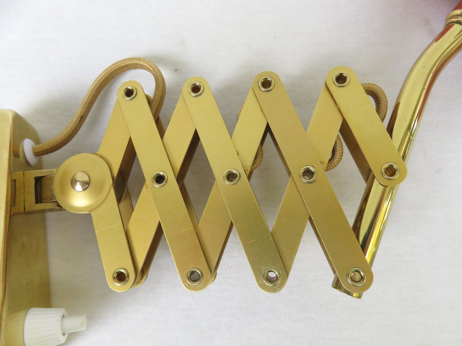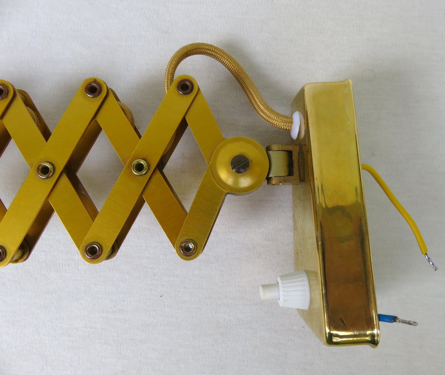 The wall brackets are made of brass, the scissors are anodized in gold, and the lampshades are painted aluminum.
