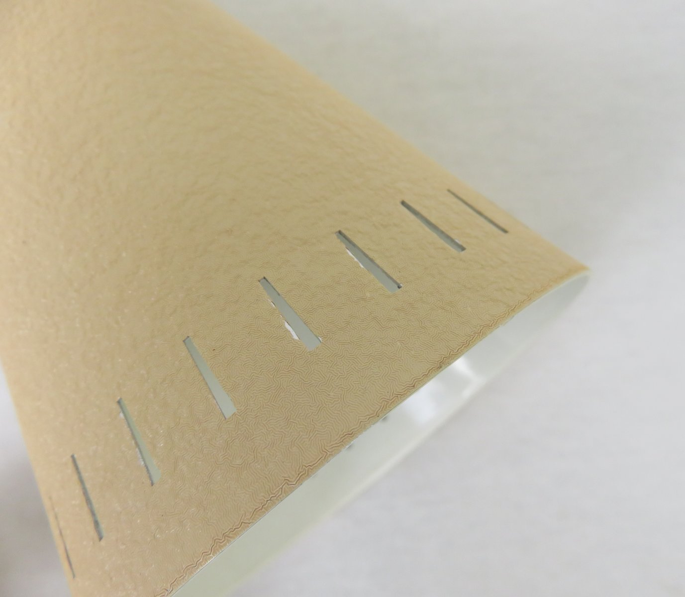 Die Wandhalterung der korallefarbenen Leuchte hat seitliche eine kleine Druckstelle, bei der Wandhalterung der beigen Leuchte wurde von unten ein Loch verschlossen (gelötet). Die Originallackierungen zeigen geringe Spuren der Zeit.