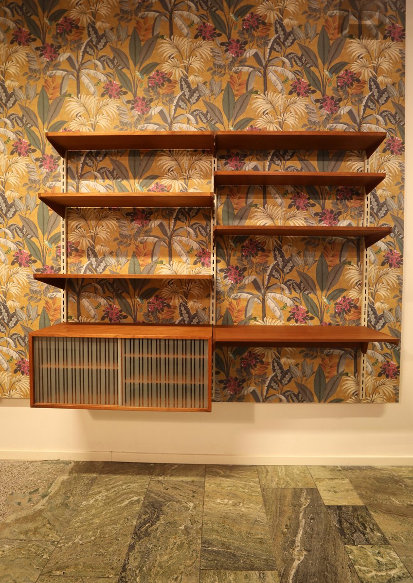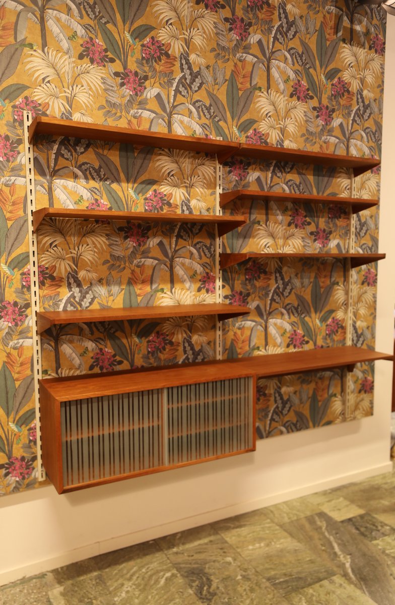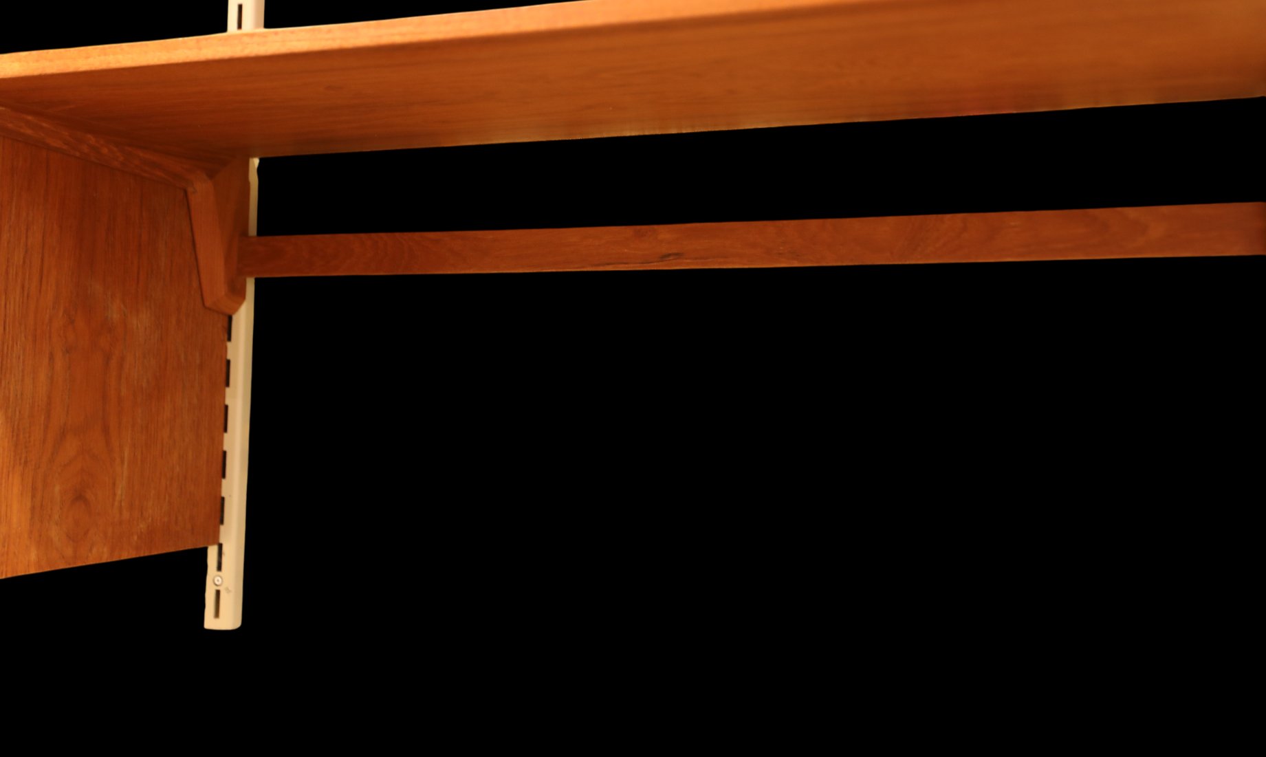 A fantastic Danish wall-mounted shelving system. The system is a true classic in teak with both character and function!