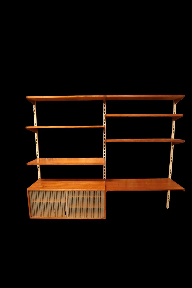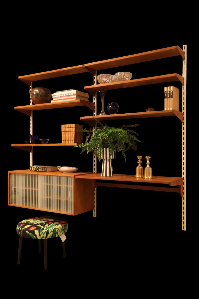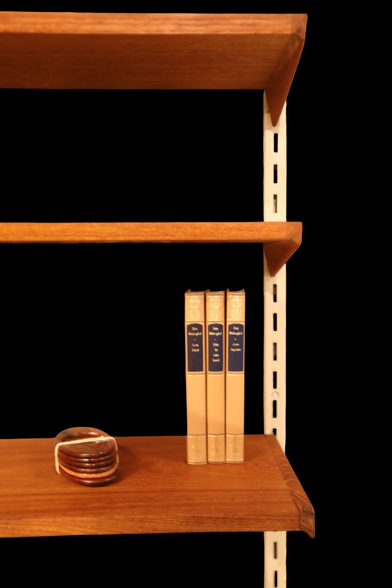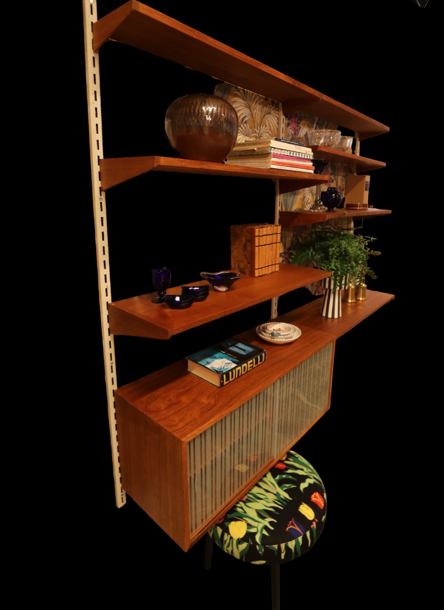 A fantastic Danish wall-mounted shelving system. The system is a true classic in teak with both character and function!