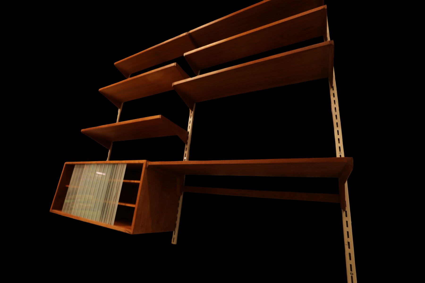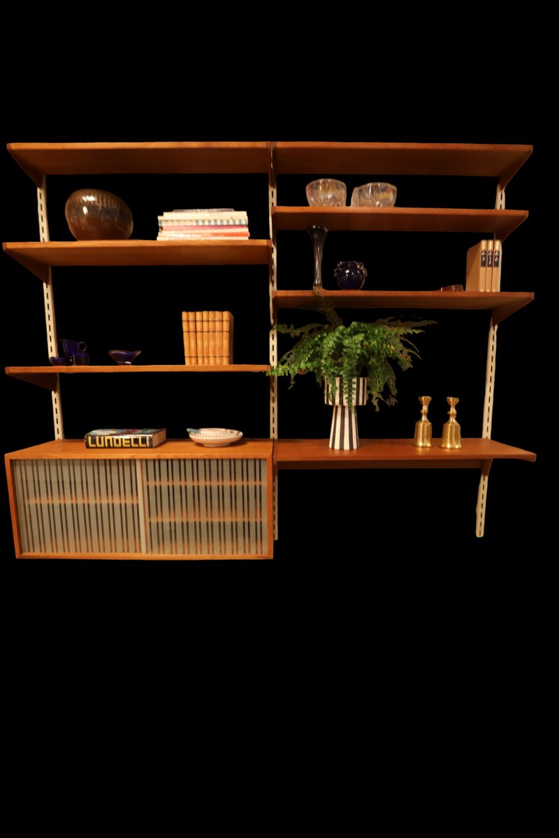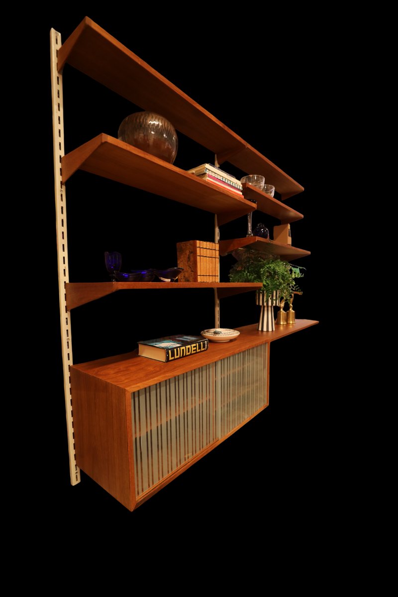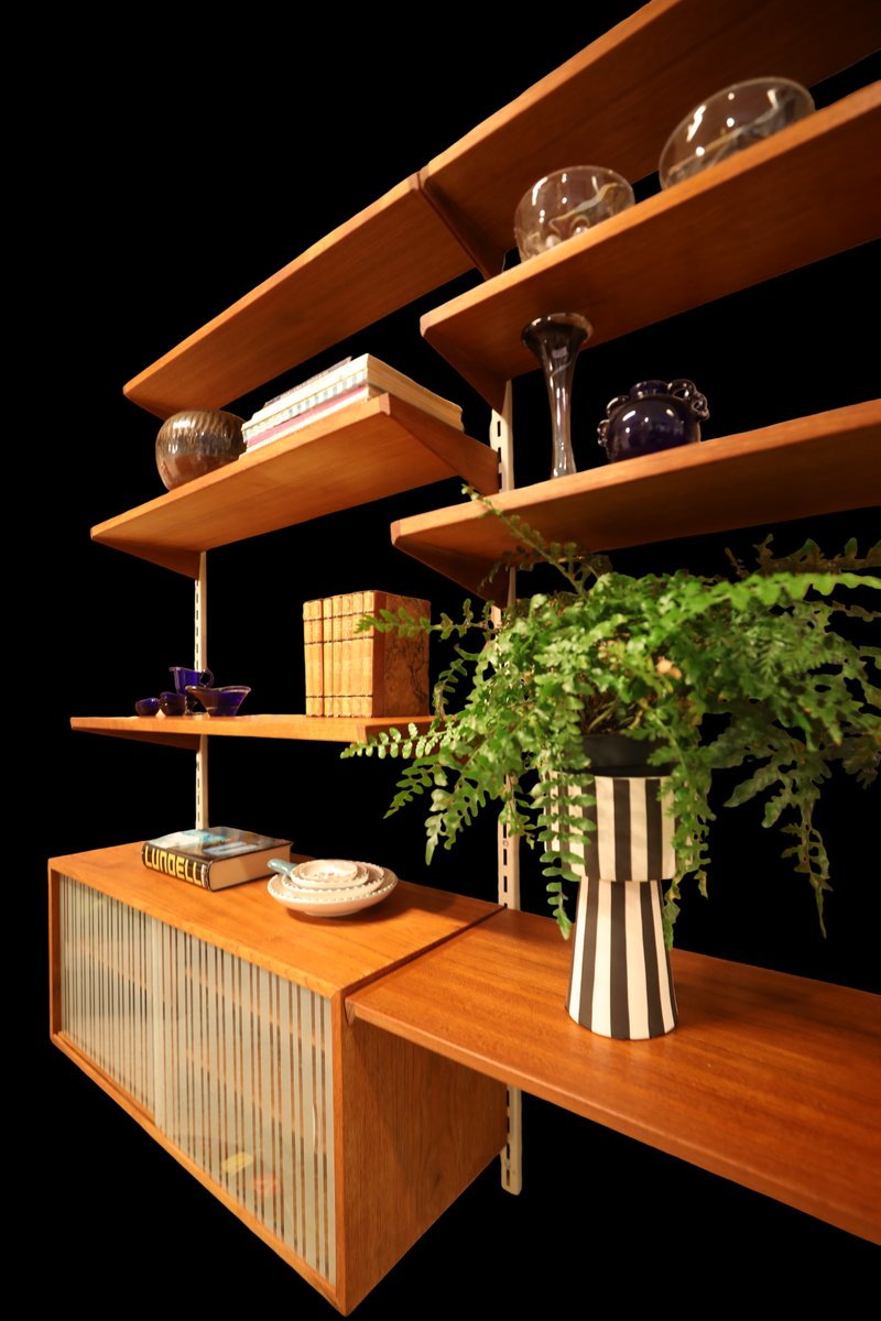 Ein fantastisches dänisches Wandregalsystem. Das System ist ein echter Klassiker aus Teakholz mit Charakter und Funktionalität! Das System besteht aus sechs Regalböden, einer Vitrine, einem verstärkten Regalboden und drei Halterungen, die ein stabiles und großzügiges System bilden, das Sie ganz nach Ihrem Geschmack zusammenstellen können. Inhalt & Tiefe der Regalböden: 1 verstärkter Regalboden – 32 cm tief (perfekt für einen Schreibtisch/Plattenspieler)