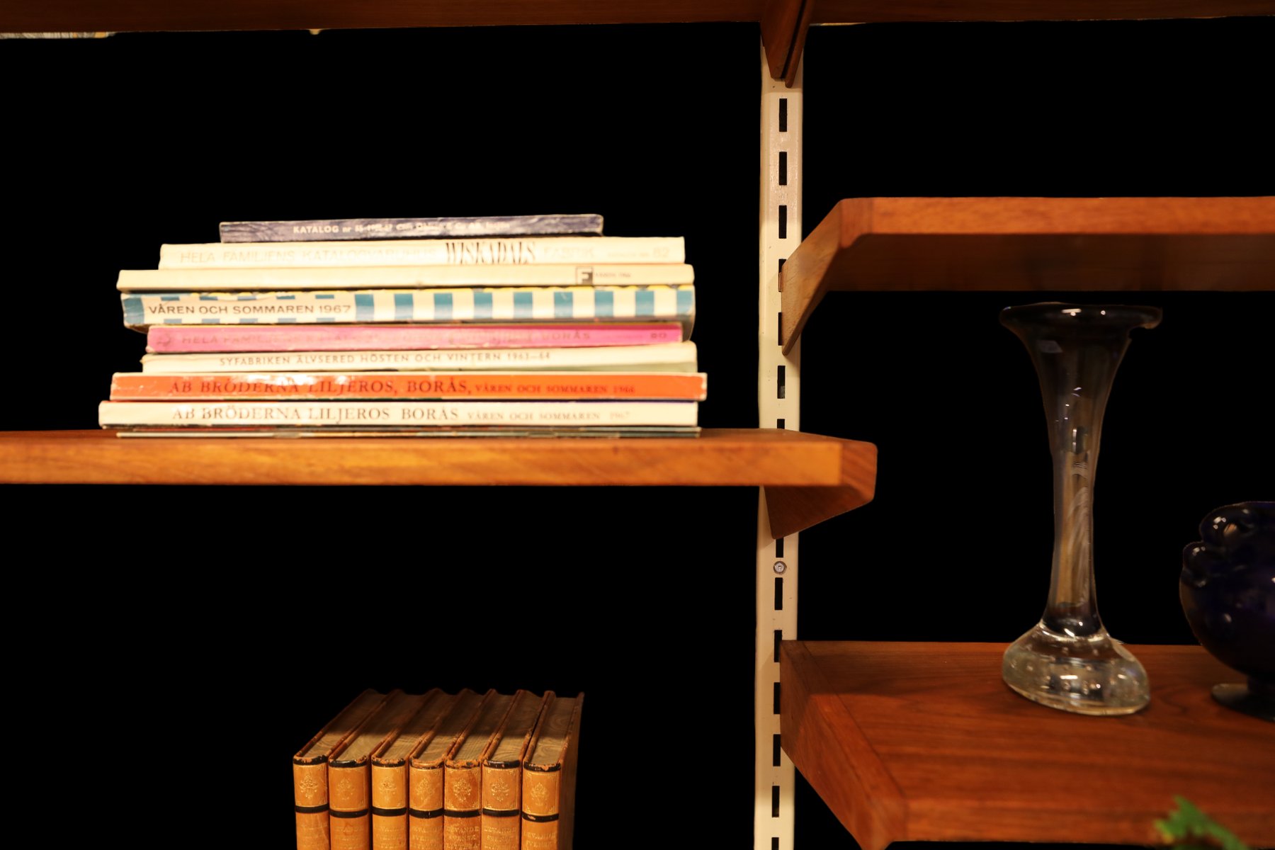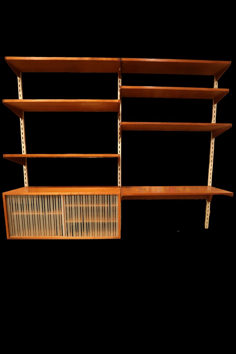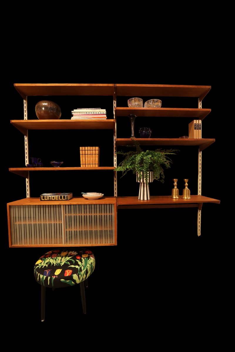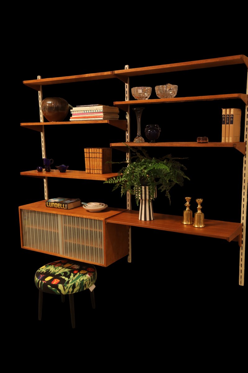 Ein fantastisches dänisches Wandregalsystem. Das System ist ein echter Klassiker aus Teakholz mit Charakter und Funktionalität! Das System besteht aus sechs Regalböden, einer Vitrine, einem verstärkten Regalboden und drei Halterungen, die ein stabiles und großzügiges System bilden, das Sie ganz nach Ihrem Geschmack zusammenstellen können. Inhalt & Tiefe der Regalböden: 1 verstärkter Regalboden – 32 cm tief (perfekt für einen Schreibtisch/Plattenspieler)