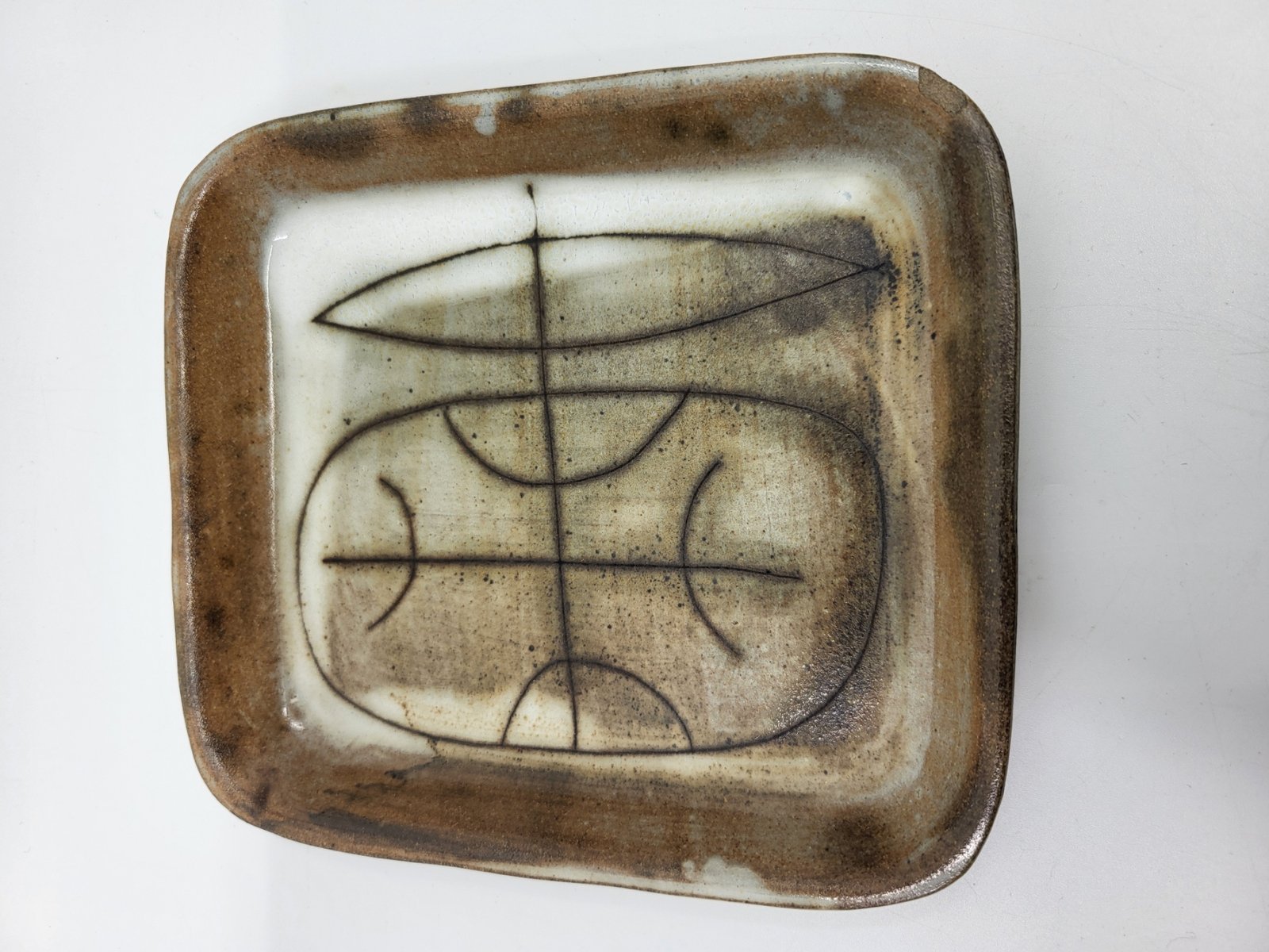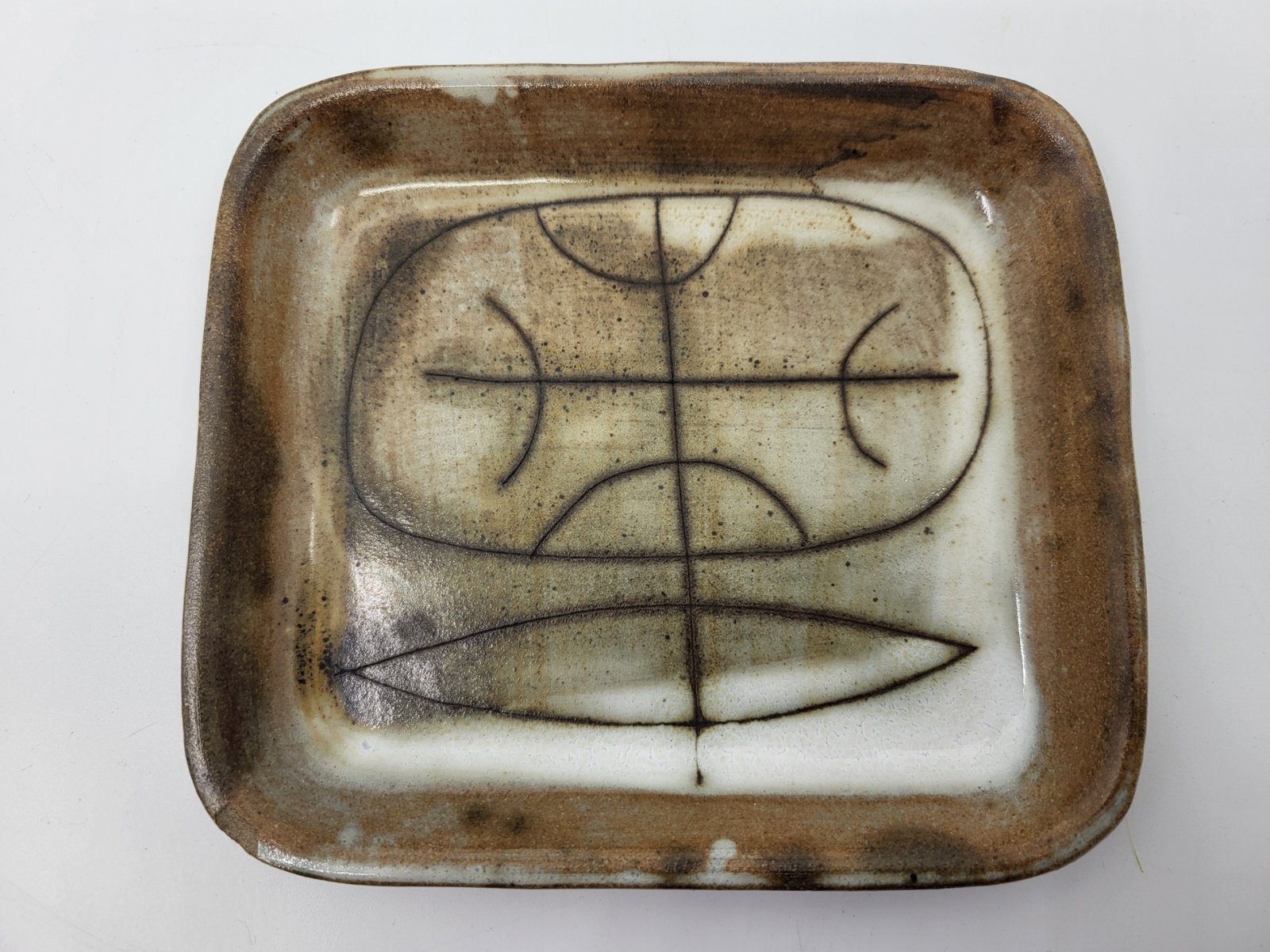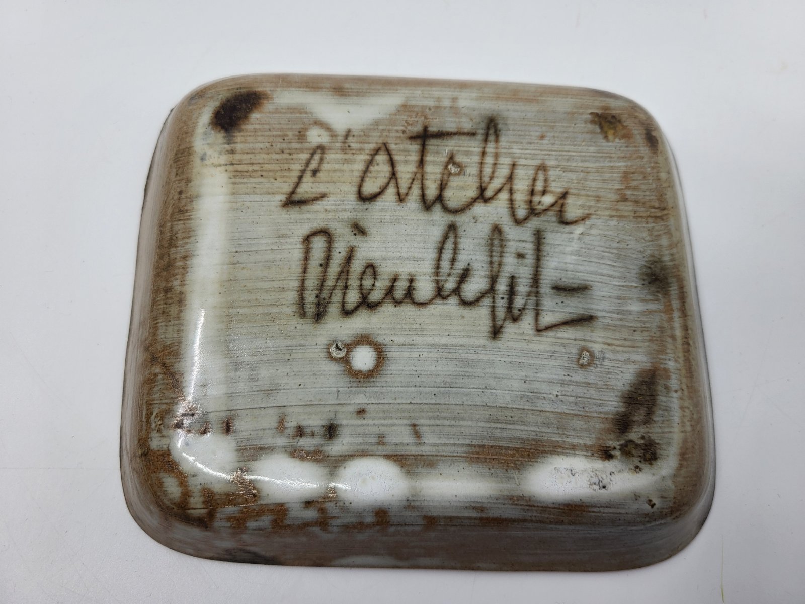 This easily recognizable Atelier Dieulefit trinket tray by Jacques Pouchain, made of glazed stoneware with abstract motifs, was produced in the 1950s. with its unique shape and vibrant colors, this piece stands out among other works of the period, truly embodying the essence of the artistic movement of its time. The subtly nuanced glaze evokes a relevant emotion and invites contemplation, prompting viewers to appreciate not only the aesthetic beauty but also the depth of human creativity that shaped this exceptional piece.